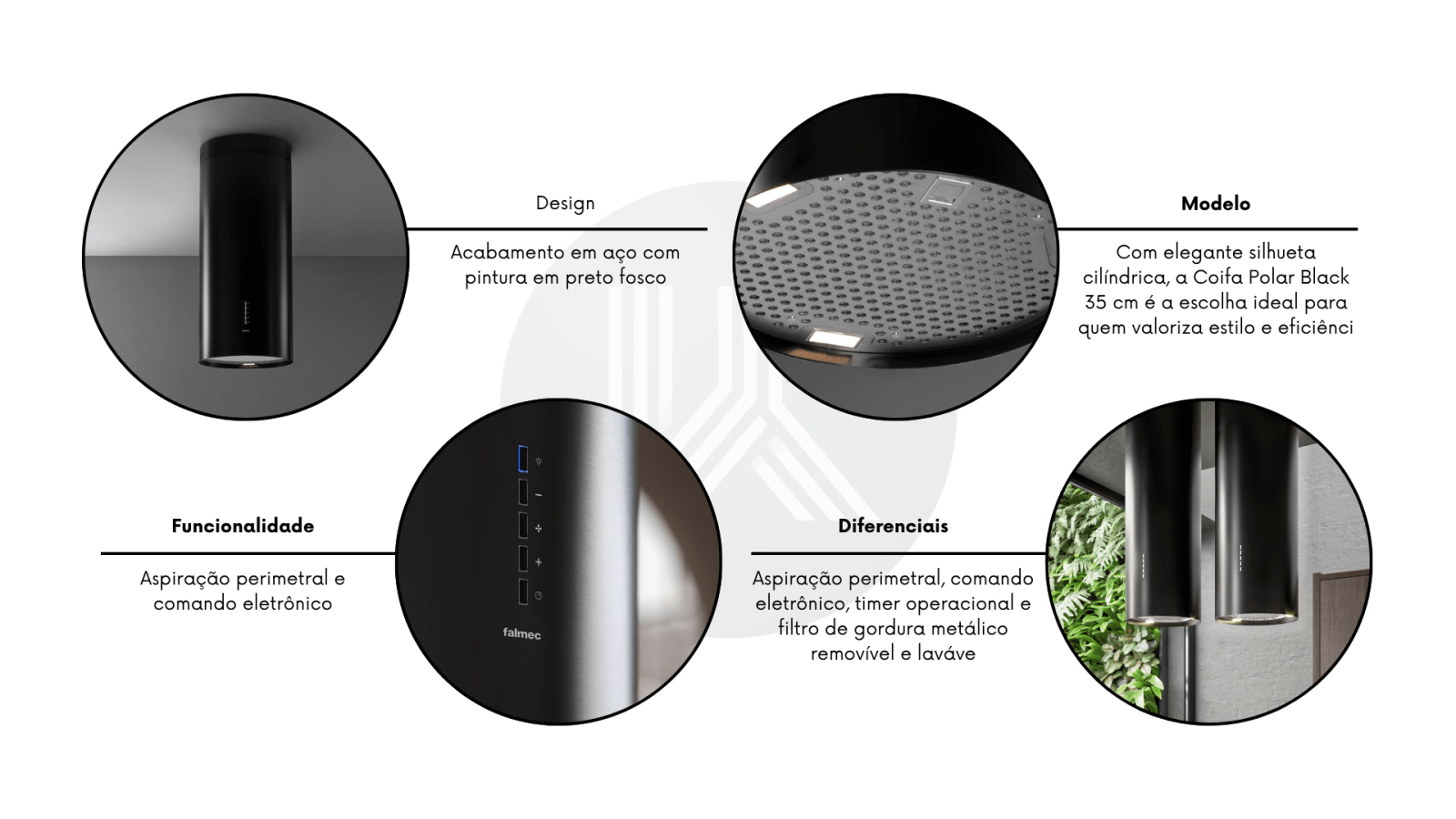 Aspiração Perimetral: Tecnologia que melhora a eficiência da sucção, reduz o ruído e direciona os vapores para as extremidades do equipamento;