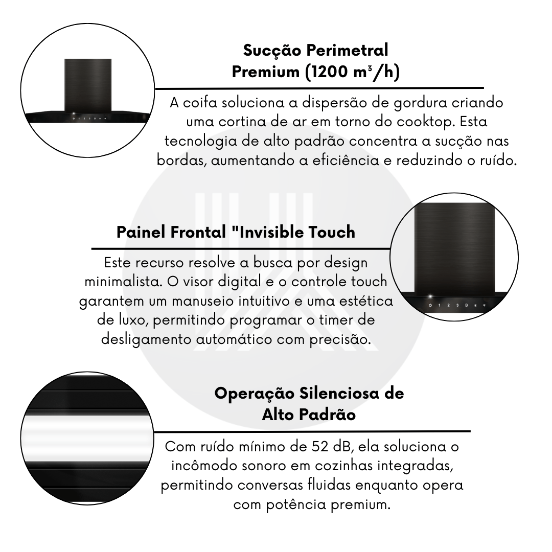 Sucção Perimetral Premium (1200 m³/h): A coifa soluciona a dispersão de gordura criando uma cortina de ar em torno do cooktop. Esta tecnologia de alto padrão concentra a sucção nas bordas, aumentando a eficiência e reduzindo o ruído.
