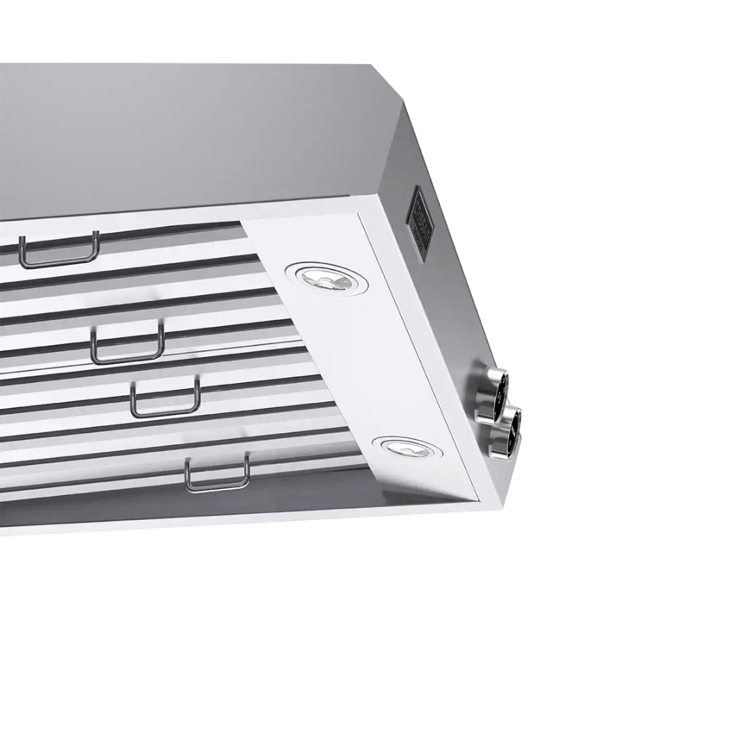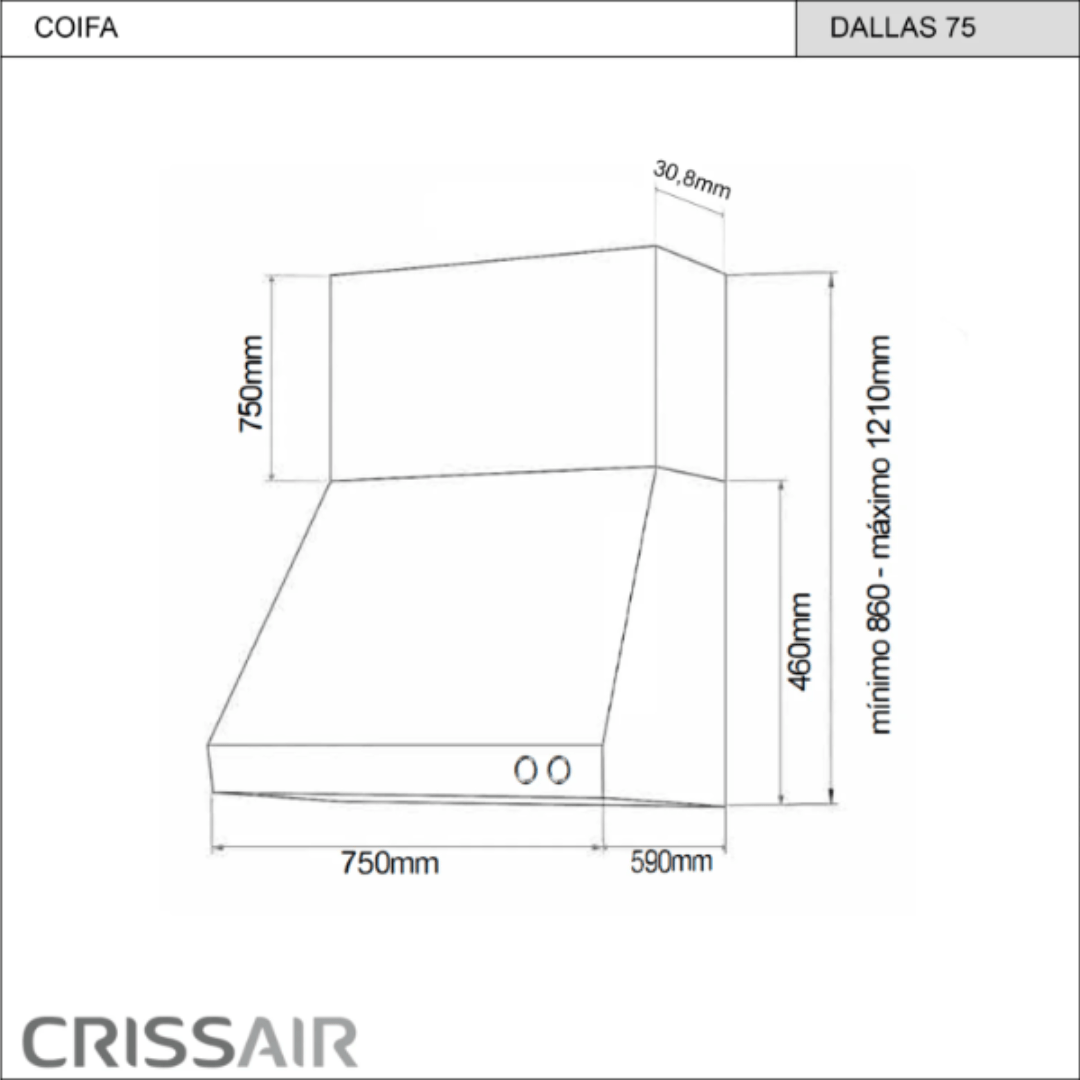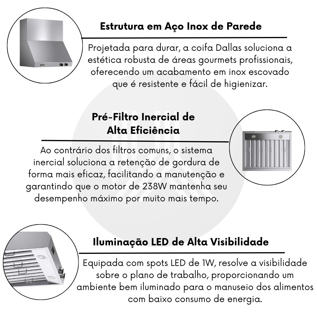 Estrutura em Aço Inox de Parede: Projetada para durar, a coifa Dallas soluciona a estética robusta de áreas gourmets profissionais, oferecendo um acabamento em inox escovado que é resistente e fácil de higienizar.