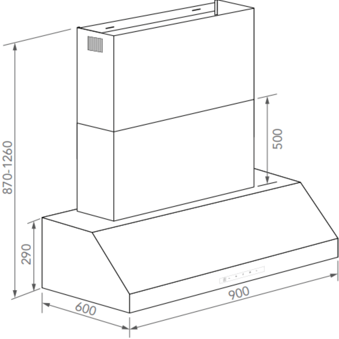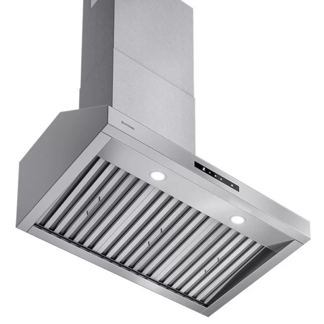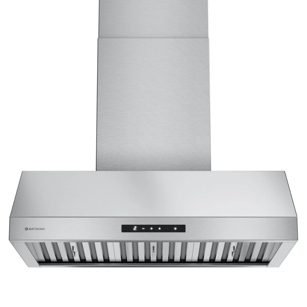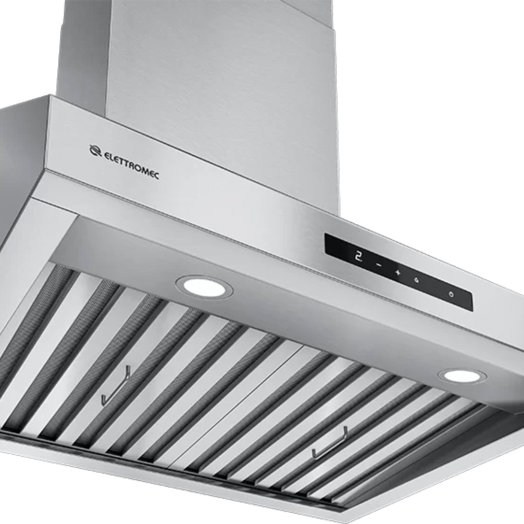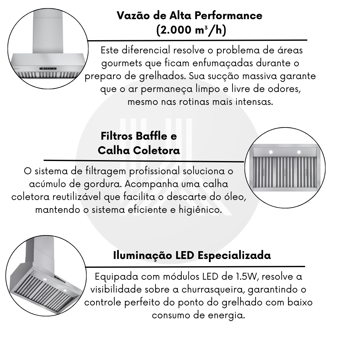 Largura Ideal de 90 cm: Perfeita para resolver a cobertura técnica sobre churrasqueiras de médio e grande porte, garantindo que toda a área de cocção seja abrangida pela sucção dos motores.