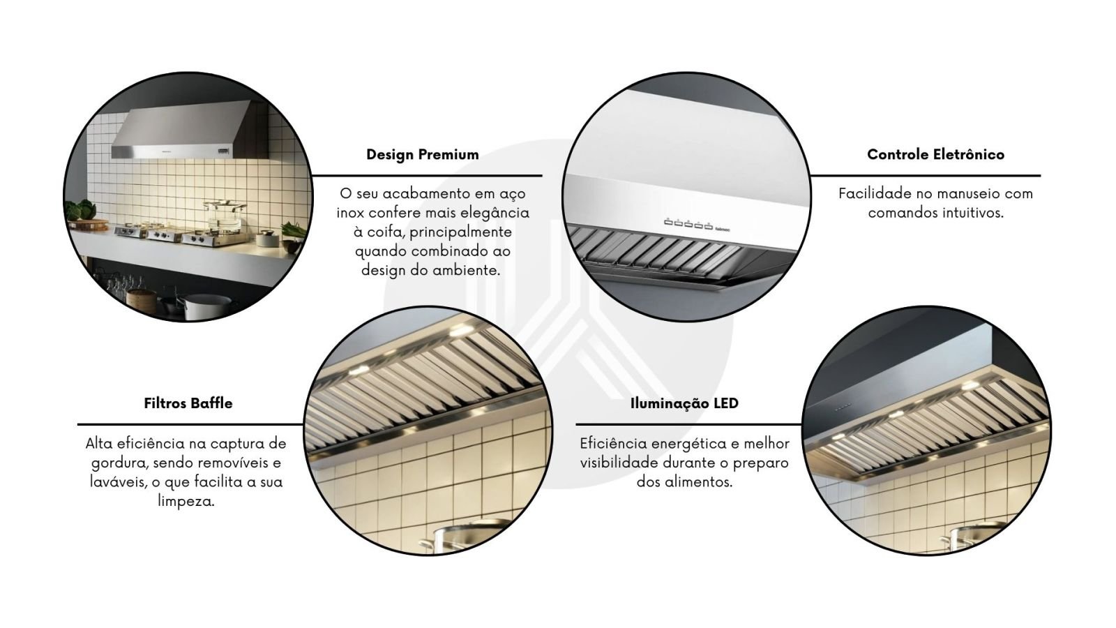 Design Premium: Com acabamento em aço inoxidável AISI 304, a coifa oferece durabilidade e um visual elegante que se integra harmoniosamente a ambientes modernos;