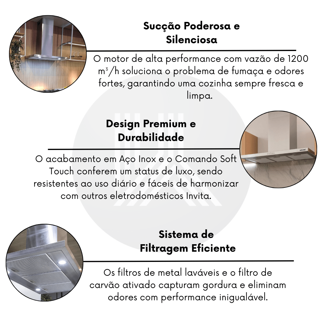 Sucção Poderosa e Silenciosa: O motor de alta performance com vazão de 1200 m³/h soluciona o problema de fumaça e odores fortes, garantindo uma cozinha sempre fresca e limpa.