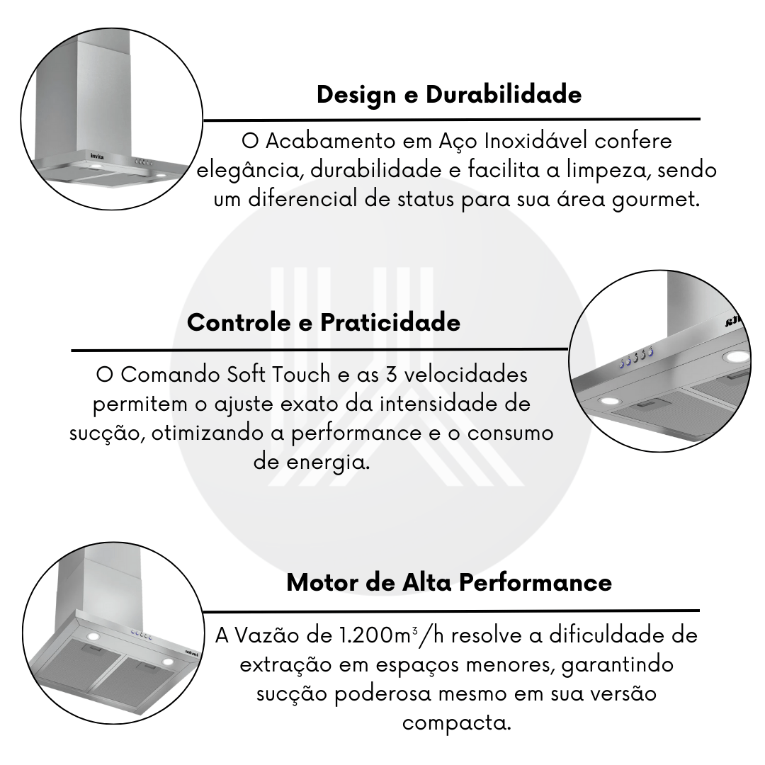 Potência Profissional em 60 cm: A Vazão de 1.200m³/h resolve a dificuldade de extração em espaços menores, garantindo sucção poderosa mesmo em sua versão compacta.