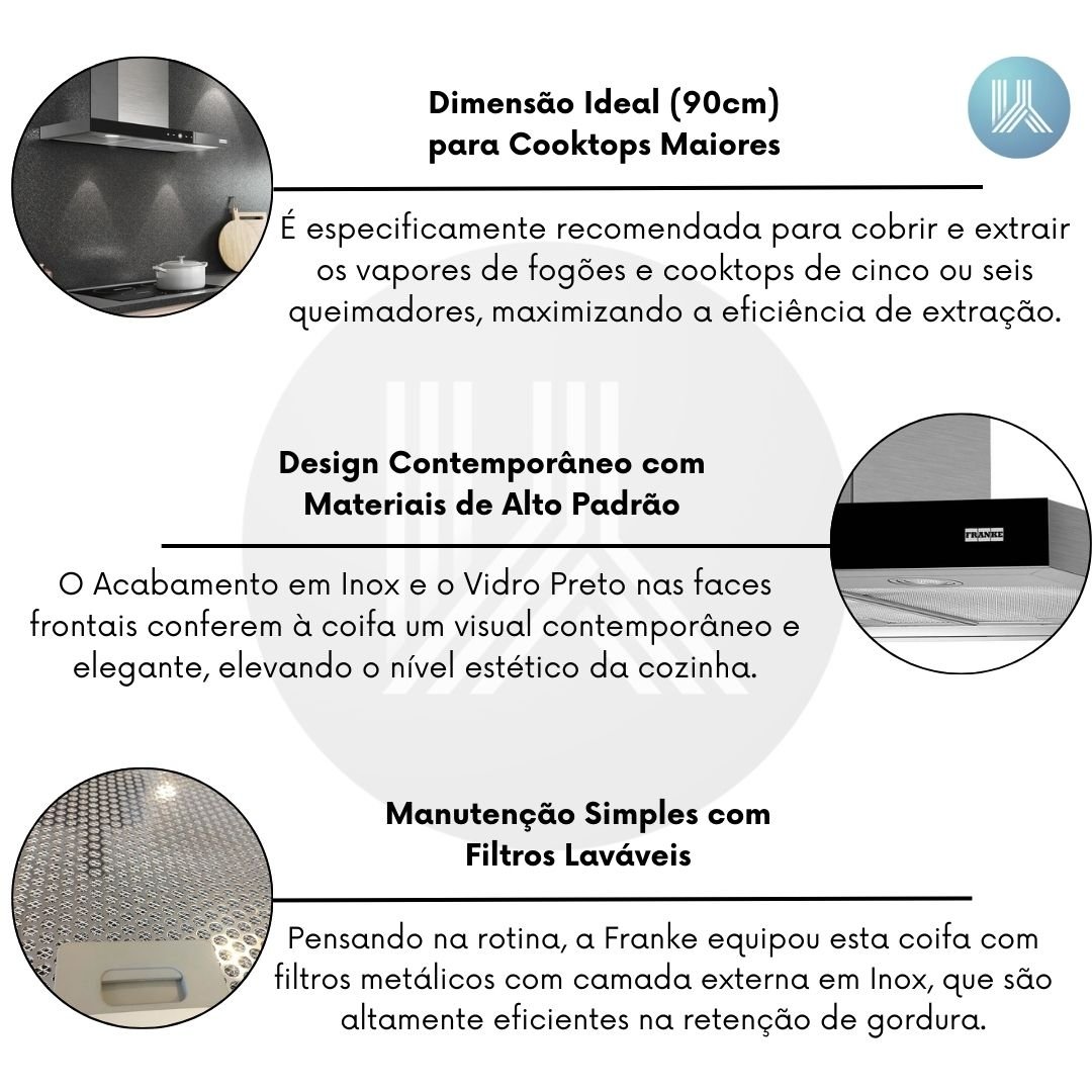 | Indicada para Fogões e Cooktops | De até 90cm (5 ou 6 queimadores) |