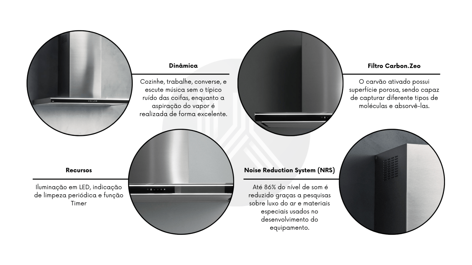 Tecnologia NRS (Noise Reduction System): Reduz até 86% do ruído típico das coifas convencionais, tornando o ambiente mais agradável e silencioso para cozinhar, conversar ou ouvir música;