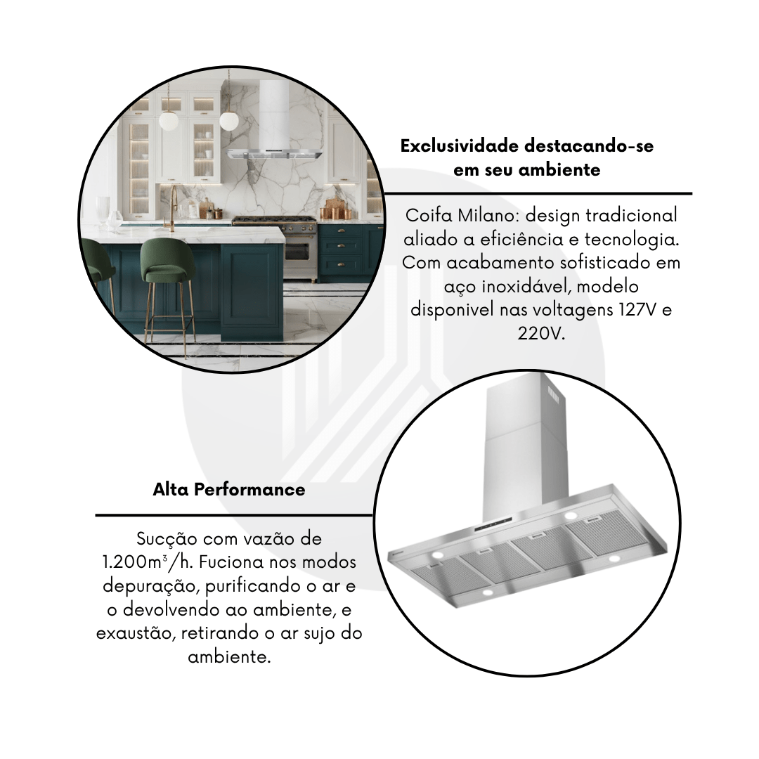A Coifa de Parede Elettromec Milano 120 cm é a solução definitiva para cozinhas amplas, combinando o design clássico com performance superior. Com 120 cm de largura, ela oferece uma ampla área de captação, sendo perfeita para cozinhas maiores e sobre cooktops de grande porte. Seu design tradicional em Aço Inoxidável foi atualizado com um novo motor mais potente, que garante uma remoção de fumaça e odores ainda mais eficiente.