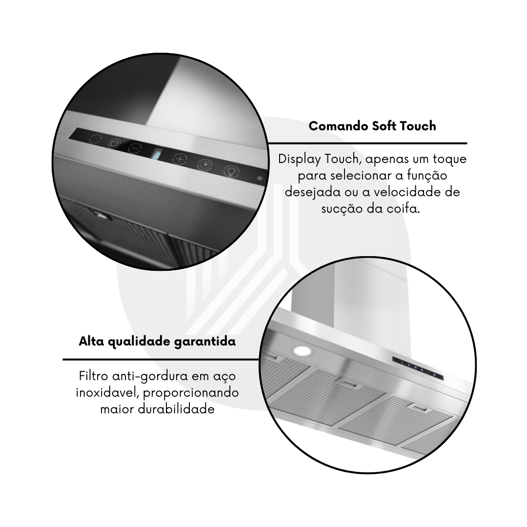 A performance é garantida pela potente vazão de 1.200 m³/h. O controle é facilitado pelo novo Display Digital Touch, que permite selecionar a função desejada com apenas um toque. O modelo oferece total flexibilidade, operando como Depurador (purificando o ar e o devolvendo ao ambiente) ou como Exaustor (retirando o ar sujo). Conta ainda com Função Timer para programação do desligamento automático e uma iluminação em LED potente e econômica, que garante perfeita visibilidade da área de cocção.