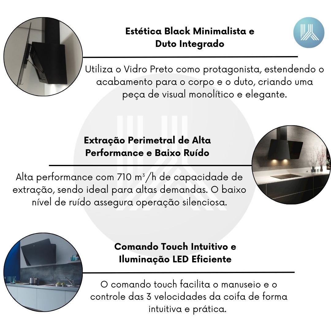 O design minimalista da Coifa Evo Black utiliza o Vidro Preto como protagonista, estendendo o acabamento para o corpo e o duto, criando uma peça de visual monolítico e elegante. Essa escolha estética assegura que a coifa não apenas cumpra sua função, mas também atue como um elemento de sofisticação na sua parede.