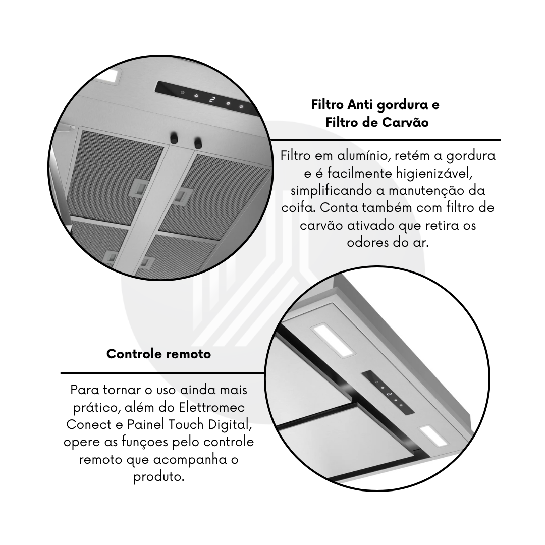 A tecnologia e a praticidade definem a operação da Coifa Sospesa. O controle é triplo, oferecendo máxima flexibilidade ao usuário: pode ser operada via aplicativo Elettromec Connect (permitindo ligar, desligar e ajustar funções com um toque no smartphone), pelo intuitivo painel Touch Digital ou pelo controle remoto que acompanha o produto. É possível escolher entre 3 níveis de velocidade para ajustar a potência de sucção conforme sua necessidade. Versátil, ela funciona perfeitamente como Exaustor (retirando o ar do ambiente) ou como Depurador, utilizando o filtro de carvão ativado para eliminar odores e devolver o ar purificado.
