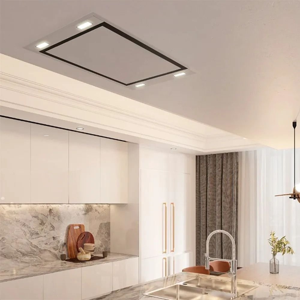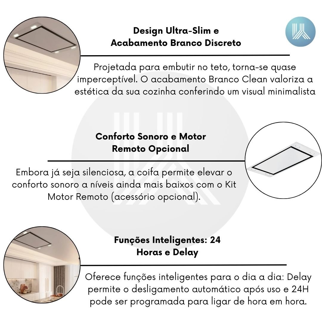 Com um design ultra-slim de 90 cm e o acabamento Branco clean, a coifa é perfeitamente projetada para embutir no teto, ficando praticamente imperceptível. Esta instalação discreta não apenas valoriza a estética da sua cozinha, mas também confere um visual minimalista, sendo um elemento ideal para ambientes que buscam funcionalidade sem interferir na decoração.