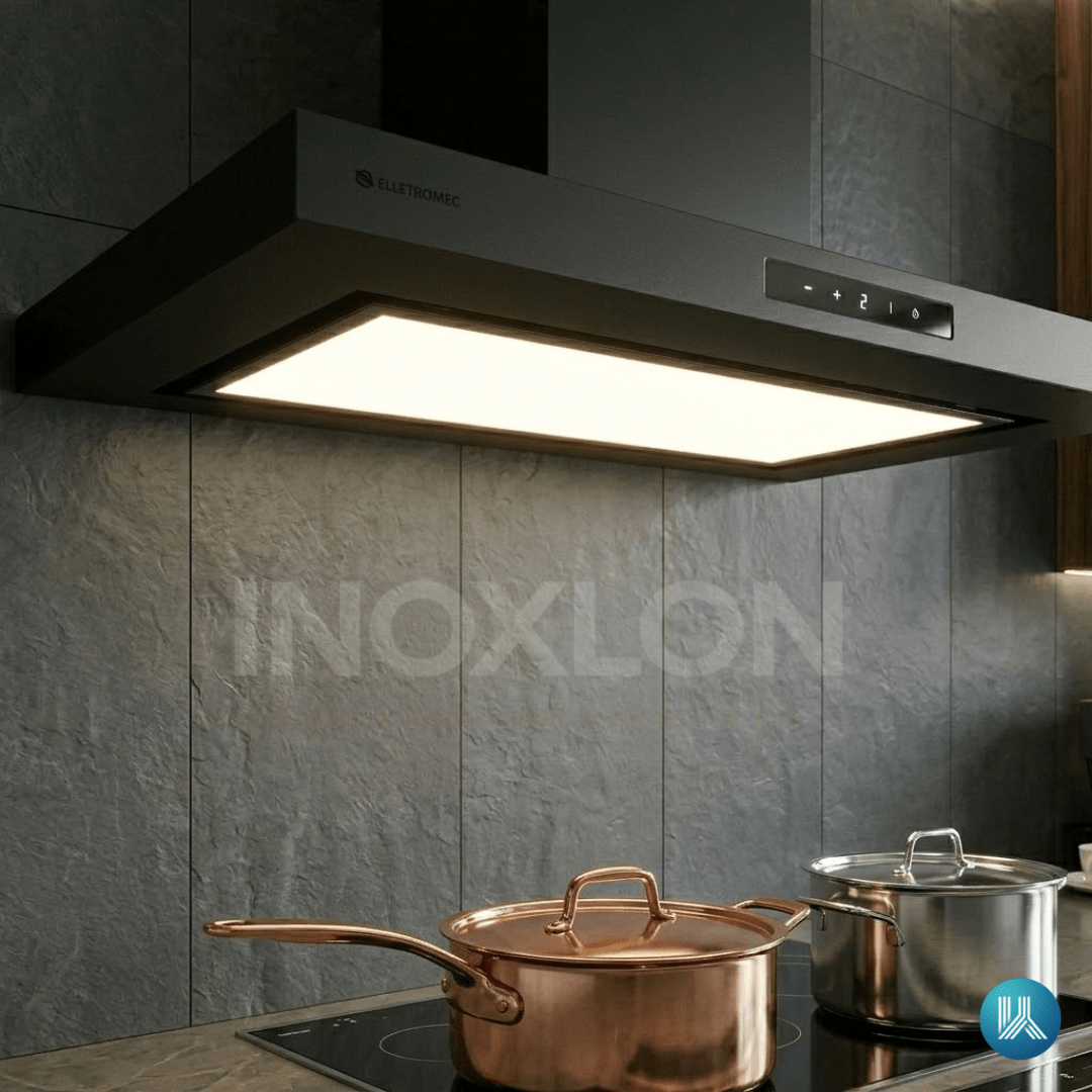 Tecnologia Elettromec Connect: A coifa soluciona a conveniência, permitindo o controle remoto de todas as funções via smartphone, oferecendo uma experiência de casa inteligente de alto padrão.