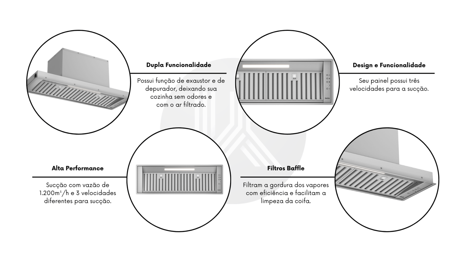 Tecnologia de Aspiração Perimetral: Esta tecnologia soluciona o problema do ruído excessivo, oferecendo melhor performance de sucção dos vapores com uma operação mais discreta.