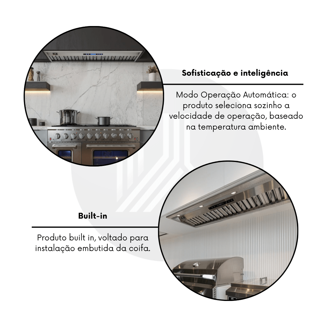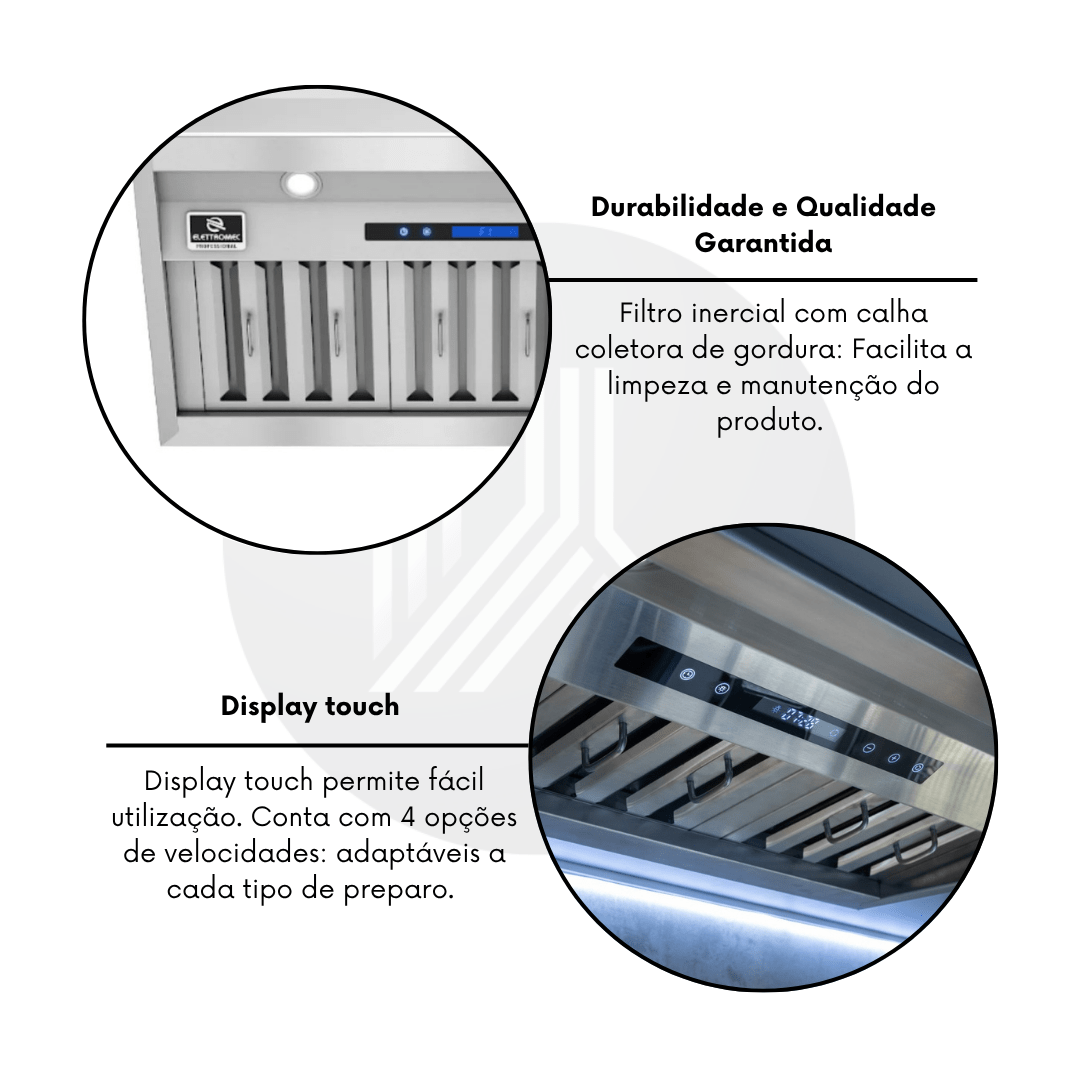 A tecnologia de controle é completa. O Display Touch permite selecionar facilmente as 4 velocidades de aspiração ou programar o Timer (para 5, 10 ou 15 minutos). O destaque é o Modo de Operação Automática, que seleciona sozinho a velocidade ideal com base na temperatura do ambiente. O sistema de filtragem é profissional, equipado com Filtro Inercial (baffle filter) que direciona a gordura para uma calha coletora, facilitando a limpeza. Possui iluminação em LED para perfeita visibilidade.