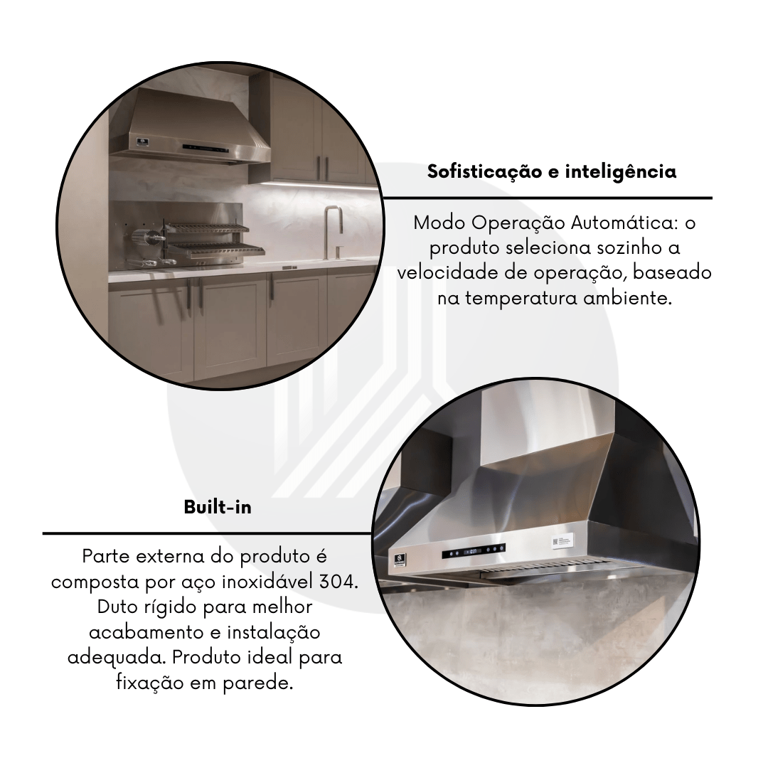 O controle é total e facilitado pelo moderno Display Touch. A coifa conta com 4 velocidades de aspiração e Timer para desligamento automático (programável para 5, 10 ou 15 minutos). O destaque é o Modo de Operação Automática, que seleciona sozinho a velocidade ideal com base na temperatura do ambiente. O sistema de filtragem é profissional, equipado com Filtro Inercial (baffle filter) que direciona a gordura para uma calha coletora, facilitando a limpeza. Possui iluminação em LED para perfeita visibilidade.