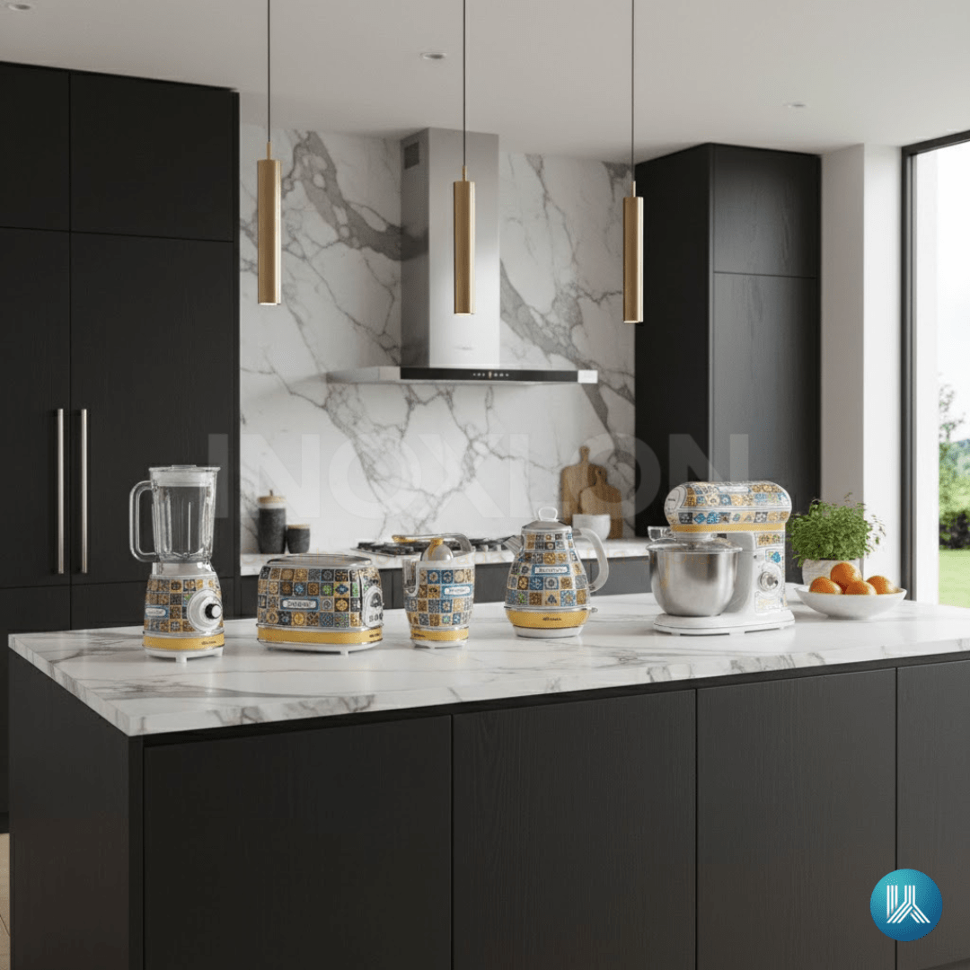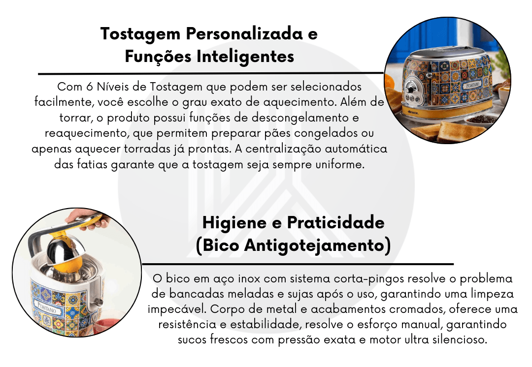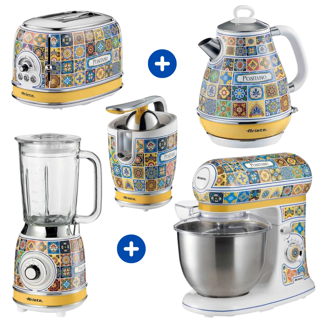 O Combo Ariete Positano Master é a materialização da elegância e da cultura italiana para residências de alto padrão. Esta curadoria premium reúne cinco equipamentos de elite — Batedeira, Liquidificador, Espremedor, Chaleira e Torradeira — que solucionam a necessidade de uma cozinha equipada com precisão profissional e estética de luxo. Com estampas vibrantes que remetem às cerâmicas tradicionais de Positano e acabamentos em aço inox e cromo, cada item entrega uma experiência sensorial única. É um investimento de luxo para quem exige performance máxima envolta em uma estética refinada que transforma a bancada em uma galeria de arte funcional.