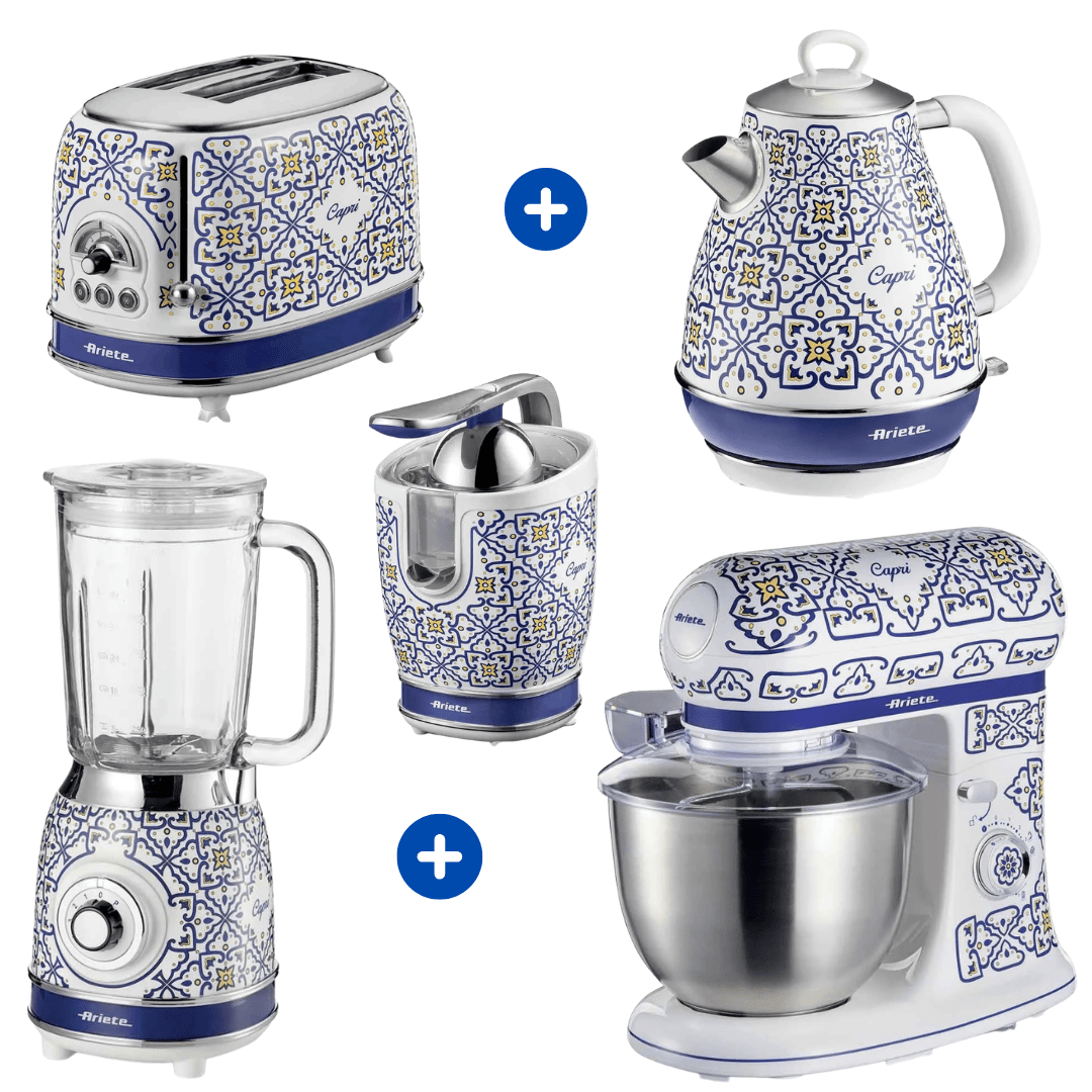 O Combo Ariete Capri Master é a materialização da elegância e da cultura italiana para residências de alto padrão. Esta curadoria premium reúne cinco ícones da engenharia europeia que solucionam a necessidade de uma cozinha equipada com precisão profissional e estética de luxo. Com estampas vibrantes que remetem ao resort de Capri e detalhes cromados impecáveis, cada item entrega uma experiência sensorial única. É um investimento de luxo para quem exige performance máxima envolta em uma estética refinada que transforma a bancada em uma galeria de arte funcional.