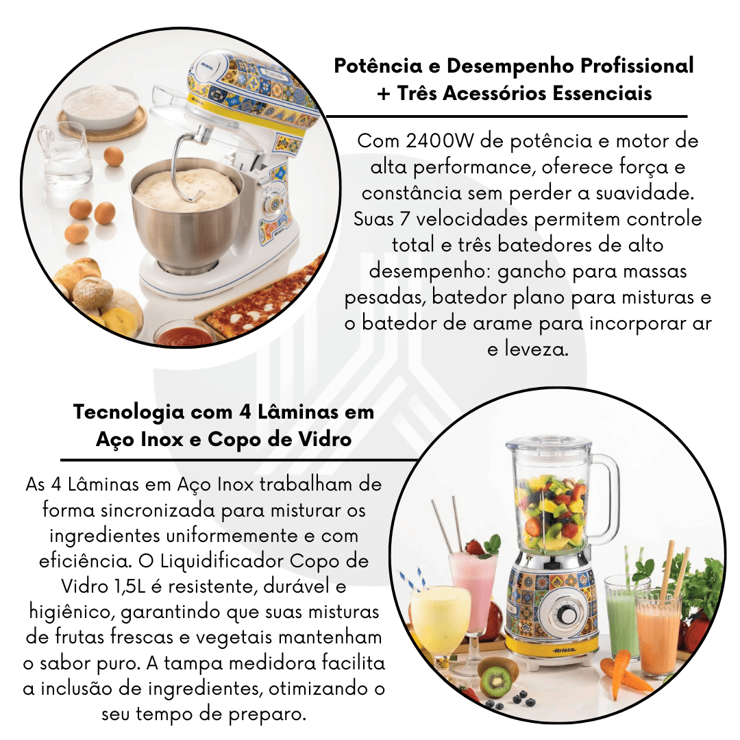 O Combo Ariete Positano Duo é a solução definitiva para quem exige performance profissional sem abrir mão de uma estética de alto padrão. Composto pela batedeira mais potente da categoria e pelo liquidificador com jarra de vidro resistente, este conjunto premium soluciona a necessidade de preparar receitas complexas — de massas pesadas a smoothies finamente triturados — com absoluta precisão. As estampas inspiradas nas majólicas da Costa Amalfitana transformam esses equipamentos em verdadeiros objetos de luxo, elevando instantaneamente o valor e a sofisticação da sua cozinha gourmet.