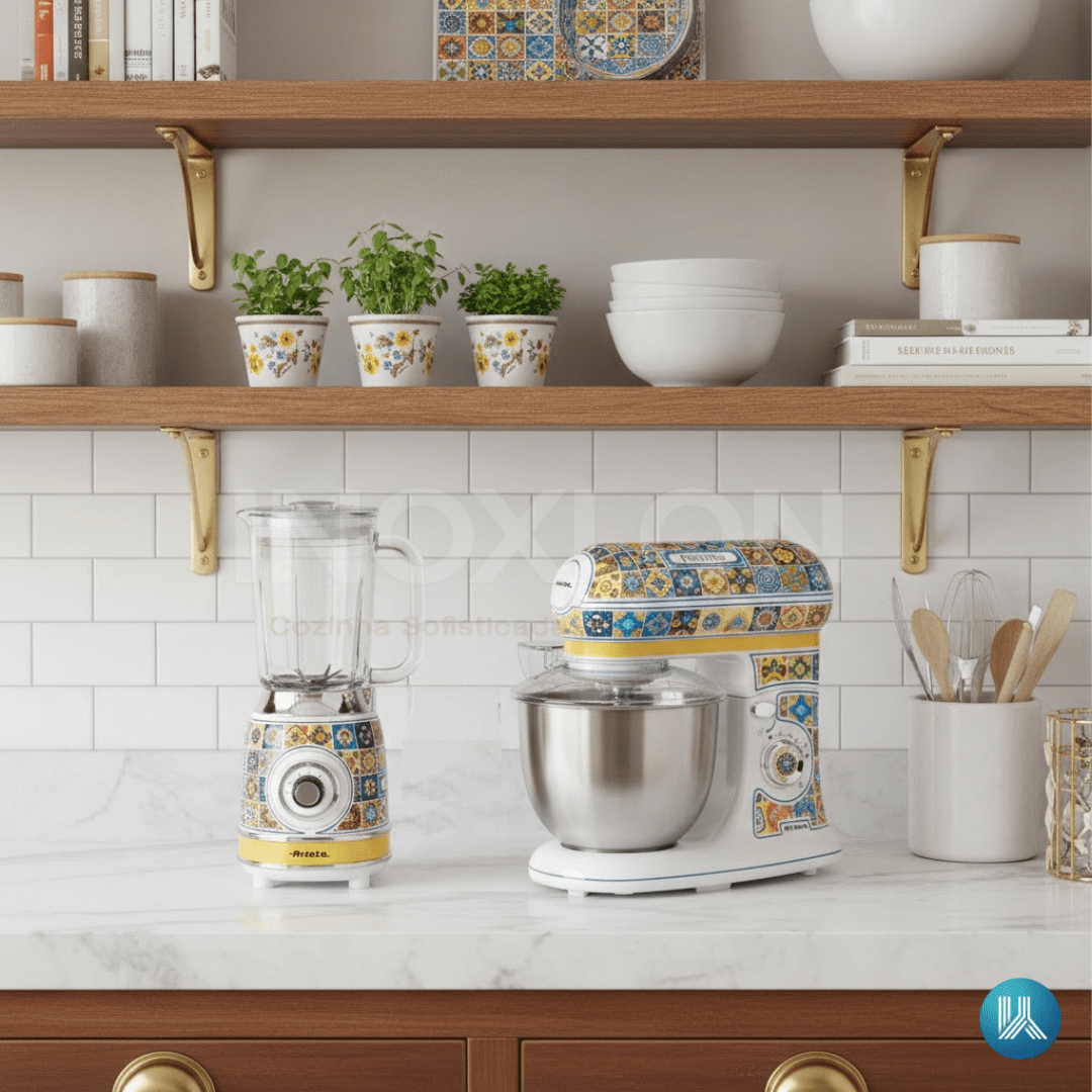 Guia de Limpeza e Conservação: Para preservar a estampa artística de luxo e a durabilidade dos componentes de alto padrão, a manutenção deve ser cuidadosa. IMPORTANTE: Antes de limpar, desconecte os aparelhos da rede elétrica. A jarra de vidro do liquidificador e a tigela inox da batedeira devem ser higienizadas com água morna e sabão neutro logo após o uso. No exterior das peças, utilize apenas um pano de microfibra macio e levemente umedecido para proteger a arte inspirada no Mediterrâneo, secando imediatamente para evitar manchas e preservar o acabamento premium. ADVERTÊNCIA! Nunca utilize palha de aço ou produtos químicos abrasivos, pois podem riscar permanentemente as superfícies de luxo e comprometer o design exclusivo da linha.