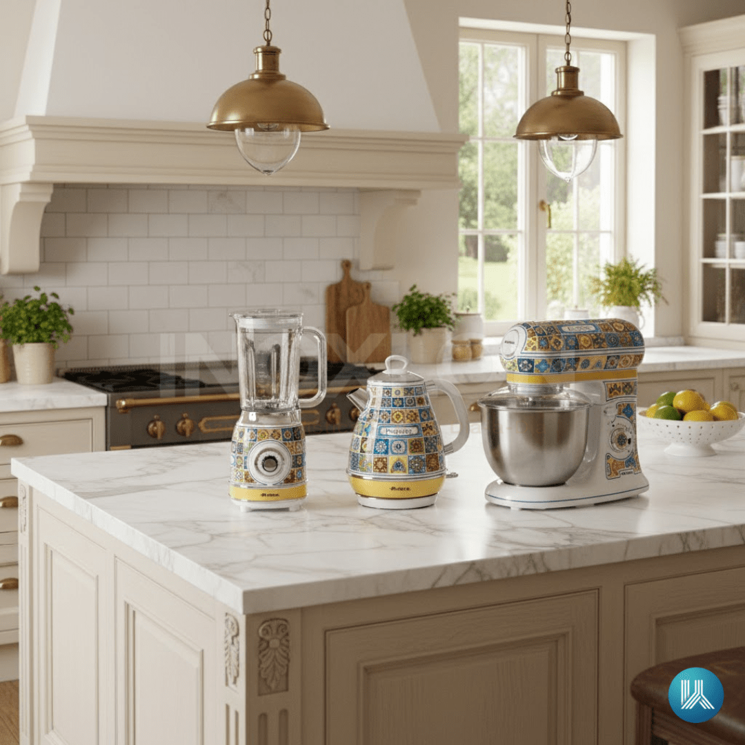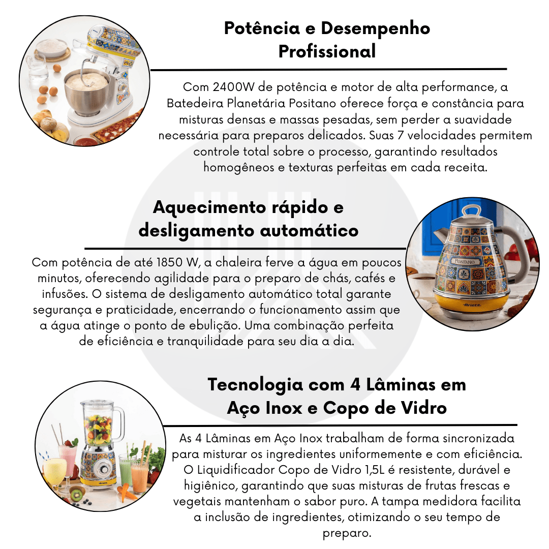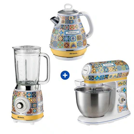 O Combo Ariete Positano é a materialização da elegância e da cultura italiana para cozinhas de alto padrão. Composto pela Batedeira Planetária de altíssima potência, pela Chaleira Elétrica em aço inox e pelo Liquidificador com jarra de vidro, este conjunto premium soluciona a necessidade de equipamentos de elite que também atuam como peças decorativas icônicas. Com estampas que remetem às tradicionais cerâmicas de Positano e acabamentos cromados de luxo, cada item entrega uma experiência sensorial única, transportando a essência do Mediterrâneo diretamente para o coração da sua residência. É um investimento de luxo para quem exige performance profissional envolta em uma estética refinada e atemporal.