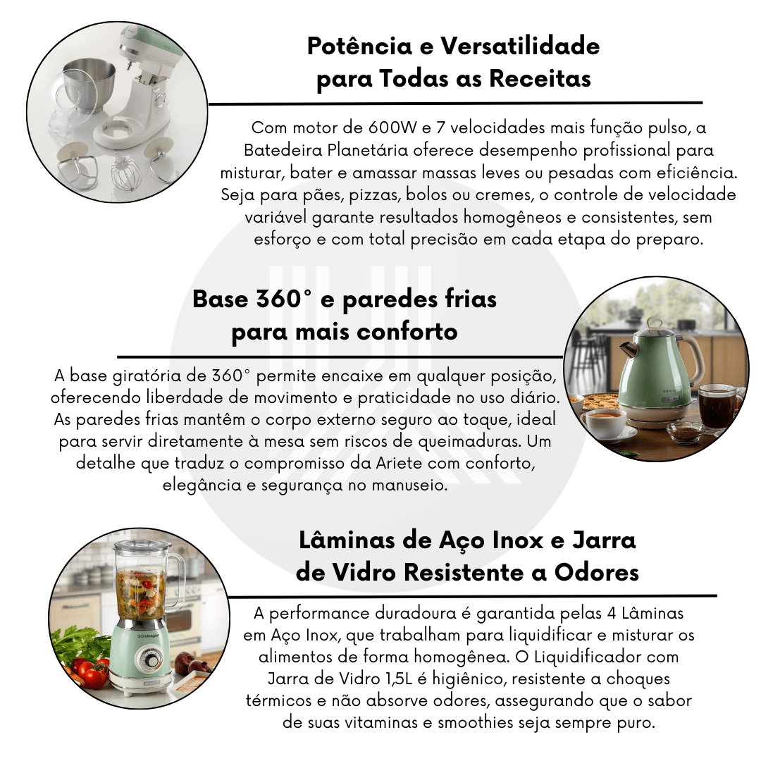 Guia de Limpeza e Conservação: Para preservar a estética premium e o brilho dos detalhes cromados da linha Vintage, a manutenção deve seguir um protocolo de alto padrão. IMPORTANTE: Antes de iniciar a limpeza, desconecte todos os aparelhos da rede elétrica. No Liquidificador, a jarra de vidro pode ser higienizada com água morna e detergente neutro logo após o uso. Na Batedeira Planetária, utilize o sistema de encaixe rápido para remover os batedores e a tigela inox, que devem ser lavados com esponjas macias para evitar riscos no metal de luxo. Para a limpeza externa dos corpos em verde menta, use apenas um pano de microfibra levemente umedecido, secando imediatamente para preservar a pintura artística. ADVERTÊNCIA! Nunca utilize palha de aço ou produtos abrasivos, pois eles danificam permanentemente o acabamento de luxo e as curvas suaves que definem o design italiano Ariete.