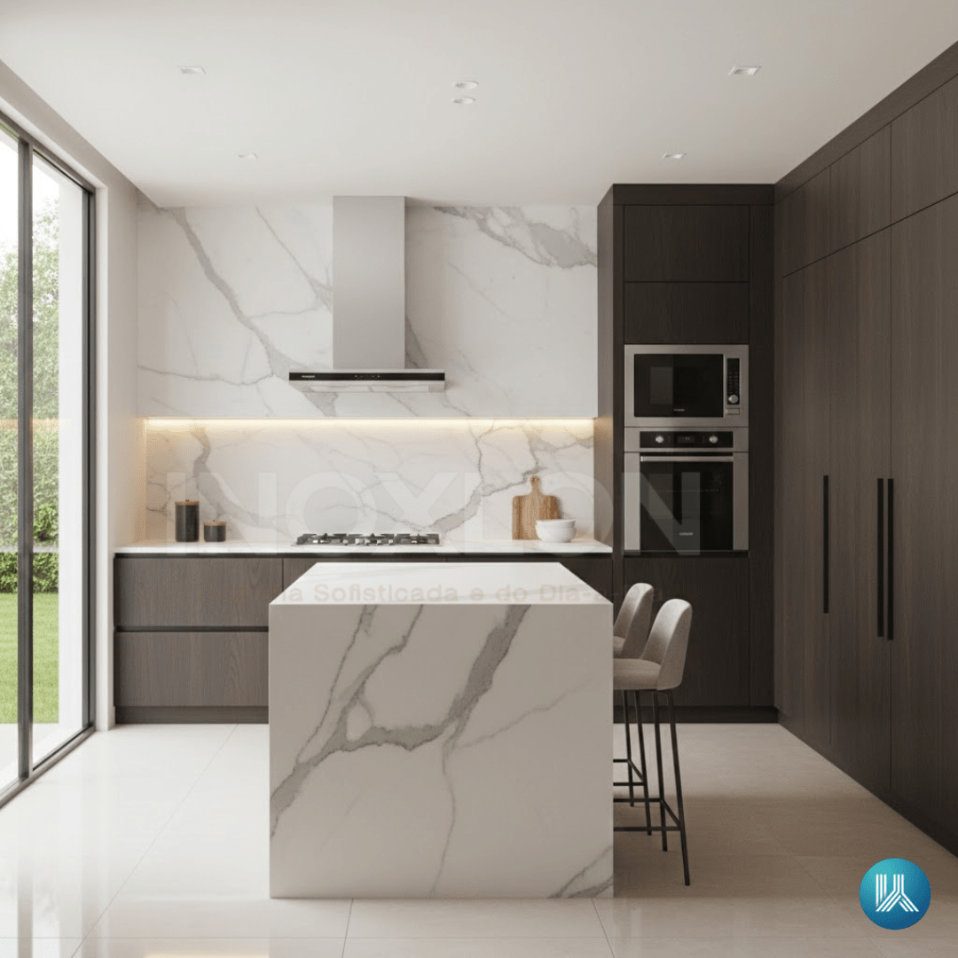 Instalação Semi-Filo em Inox 304: O acabamento superior e o design semi-filo resolvem a dificuldade de integração com a bancada, proporcionando um visual minimalista, requintado e de altíssima durabilidade.