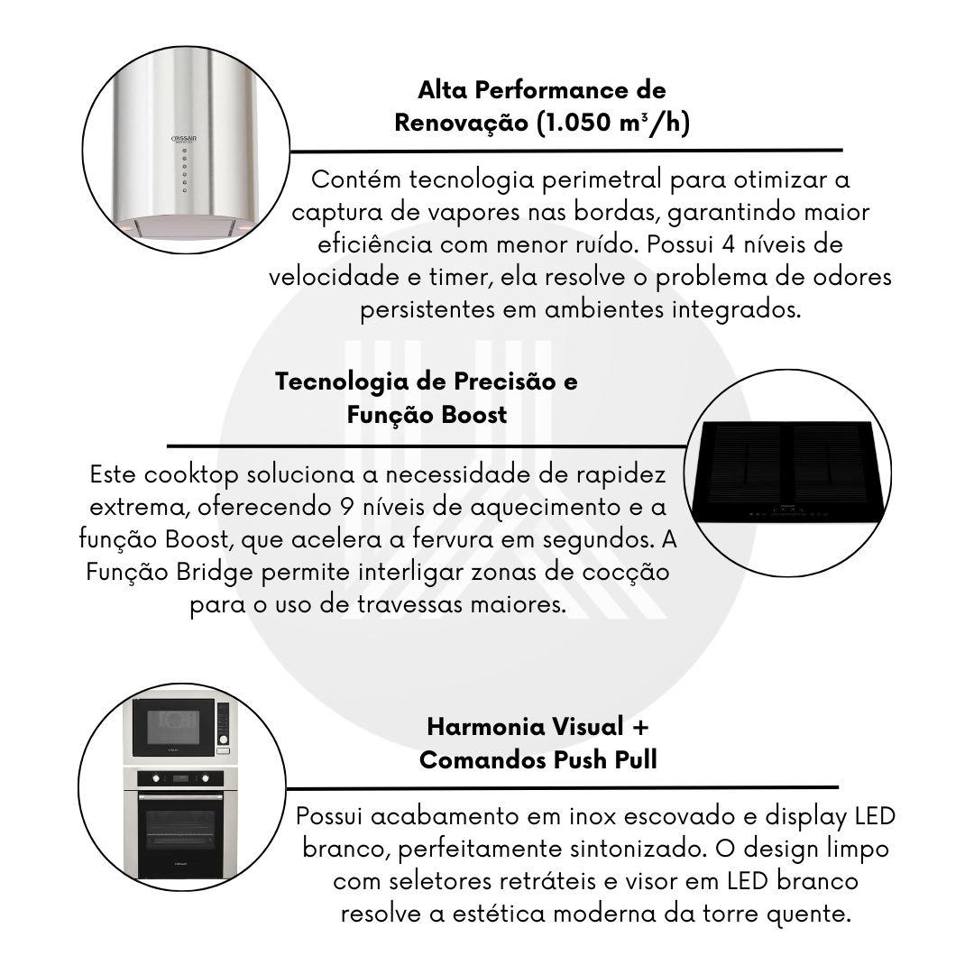 O combo Crissair Master All Black redefine o conceito de alta gastronomia residencial. Ao optar por este combo tecnológico, você soluciona integralmente a transição para uma cozinha sem chamas, unindo a precisão do Cooktop Induzione 60 — com sua superfície vitrocerâmica e funções inteligentes — à icônica Coifa de Ilha Isola Cilindro. O conjunto atinge sua máxima performance com a Torre Quente Signature, composta pelo Forno NFE 32 G3 (70L) e o Micro-ondas CFM 90 (34L). Este é um investimento duradouro em segurança e sustentabilidade, garantindo um controle térmico digital absoluto, ar puro com sucção perimetral e a sofisticação do acabamento em vidro preto e aço inox.
