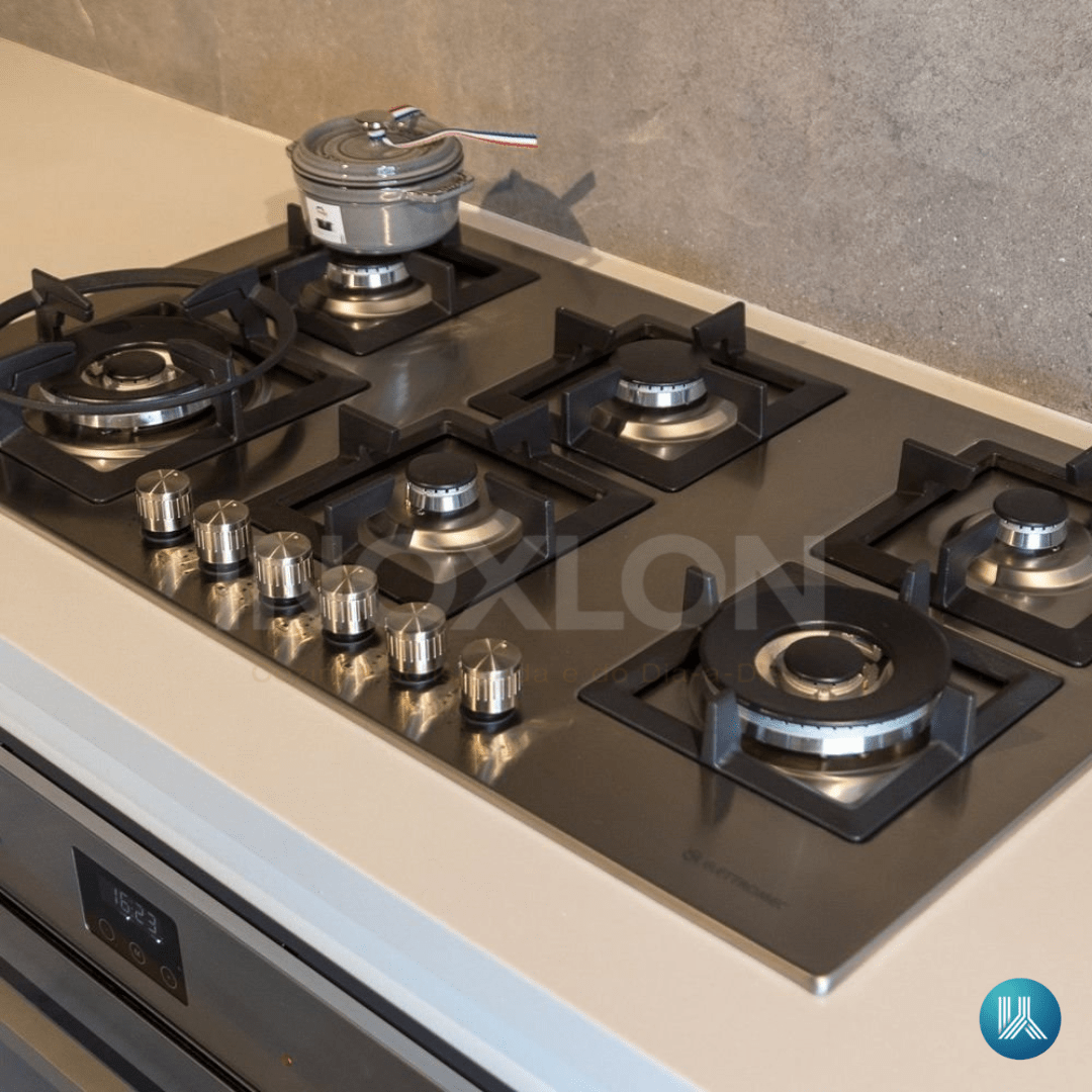 Segurança e Design Semi-Filo: As trempes em ferro fundido garantem estabilidade total, enquanto a válvula de segurança em cada queimador e a instalação semi-filo em inox escovado garantem um status de proteção e sofisticação.