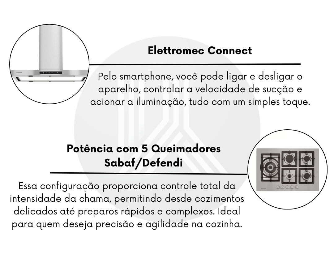 Tecnologia Connect (Wi-Fi): Esta tecnologia soluciona a necessidade de praticidade moderna ao permitir o controle total de sucção e iluminação diretamente pelo smartphone através do aplicativo Elettromec Connect.