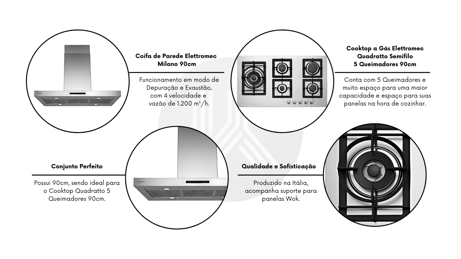 Combo Elettromec - Coifa de Parede Milano 90cm + Cooktop a Gás Quadratto 5 Queimadores 90cm