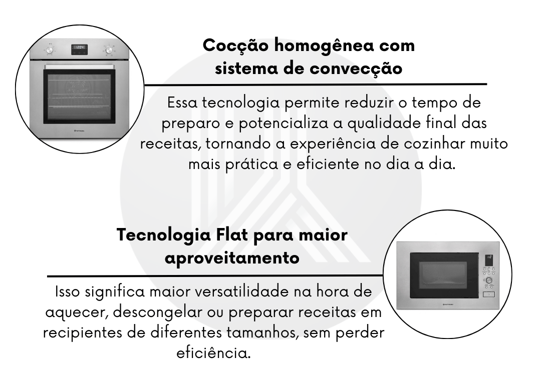 Tecnologia Flat (Sem Prato Giratório): Este sistema maximiza o espaço interno e permite o uso de recipientes retangulares grandes, o que soluciona a dificuldade de limpeza e o aproveitamento total da cavidade.