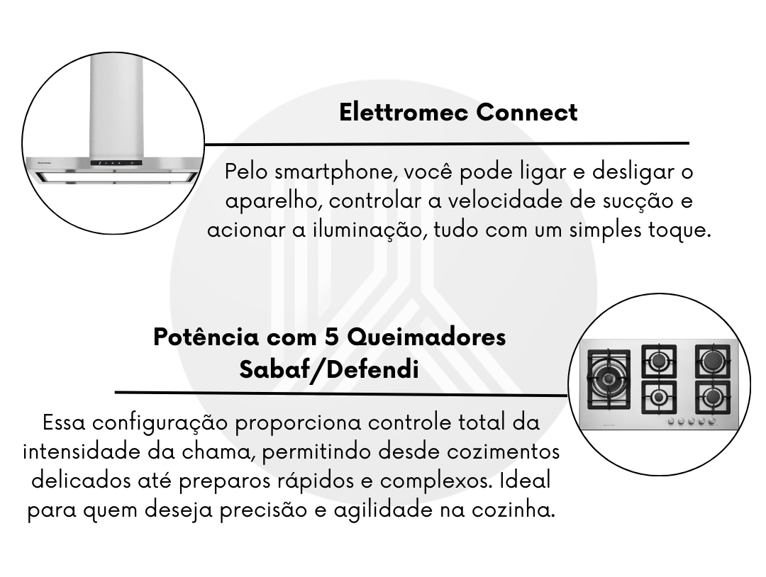 Tecnologia Connect (Wi-Fi): Esta tecnologia soluciona a necessidade de praticidade moderna ao permitir o controle total de sucção e iluminação diretamente pelo smartphone através do aplicativo Elettromec Connect.