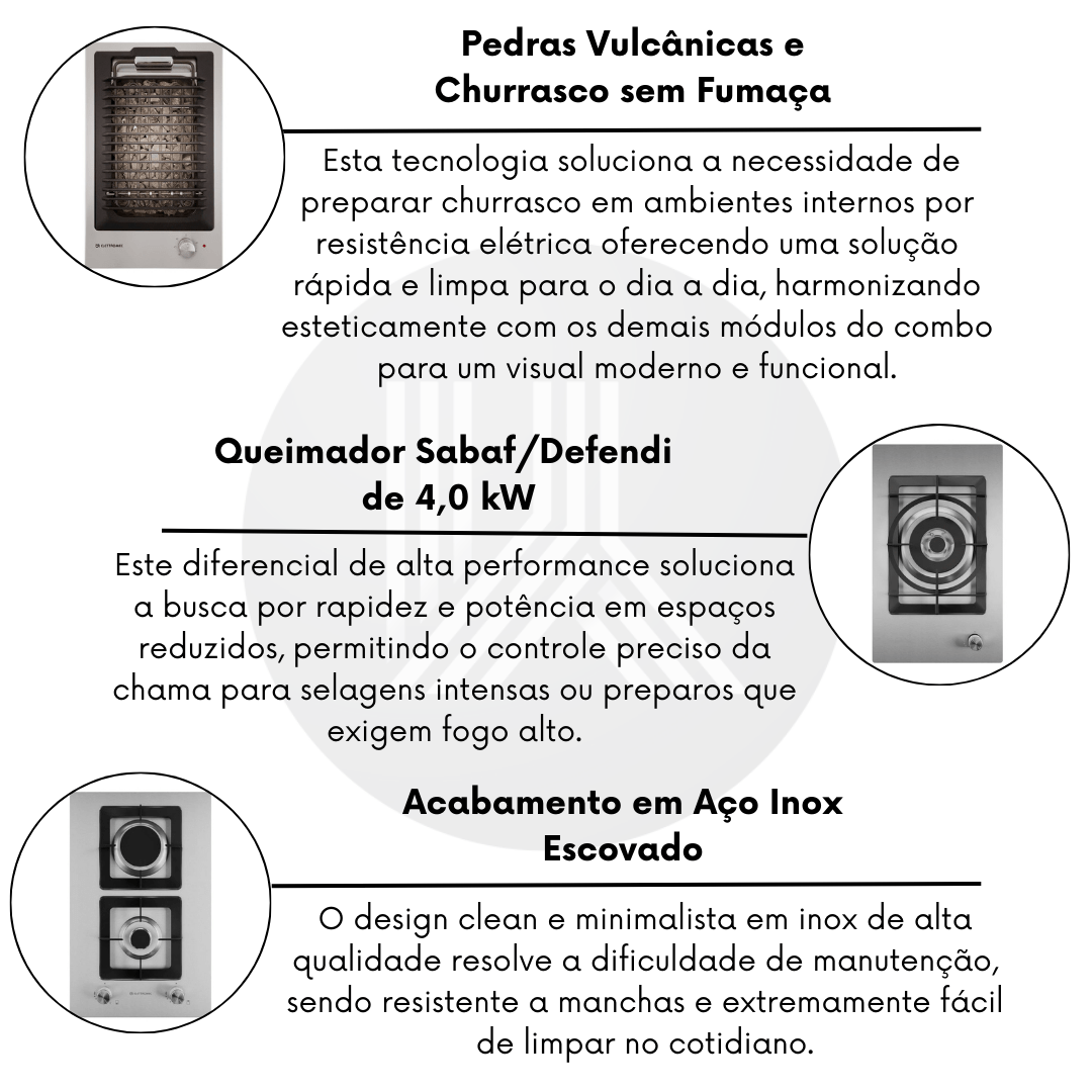 O combo Modular Elettromec Quadratto transforma sua bancada em um verdadeiro centro gastronômico multifuncional. Ao optar por este conjunto completo, você soluciona o desafio de integrar diferentes métodos de cocção — churrasco elétrico, potência de chama dupla e agilidade de queimadores rápidos — em um design compacto e harmônico. Este conjunto une a inovação do Dominó Barbecue com pedras vulcânicas, a força bruta do Dual Flame de 4,0 kW e a versatilidade do Cooktop de 2 Queimadores. É um investimento duradouro que permite preparar desde um churrasco sem fumaça em ambientes internos até receitas orientais complexas, garantindo eficiência, segurança e a sofisticação da engenharia italiana. Adquirir o combo completo simplifica seu projeto de marmoraria e marcenaria, oferecendo uma solução premium e integrada para varandas gourmet e cozinhas planejadas.