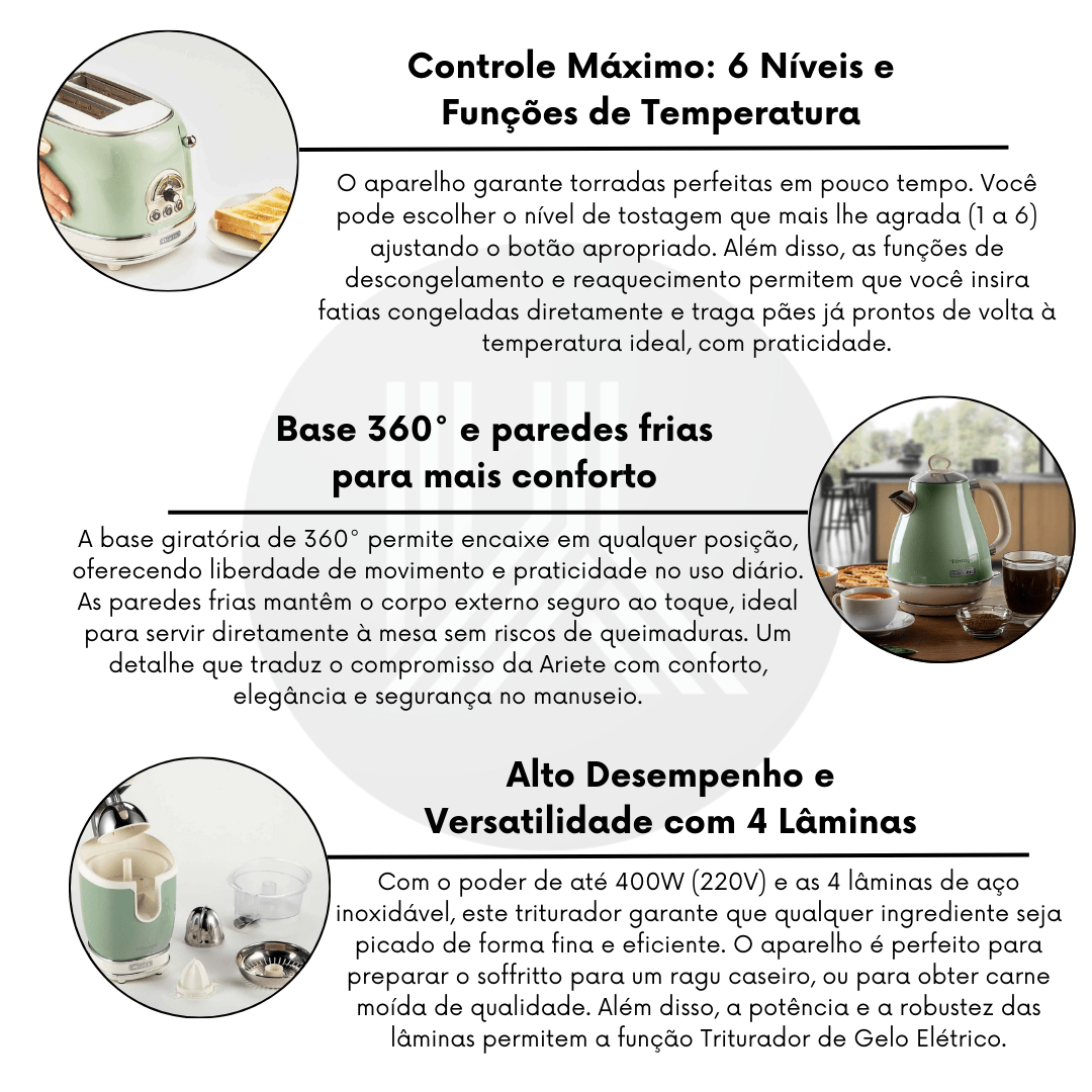 O Combo Ariete Vintage Verde é a materialização do requinte e do bom gosto para residências de alto padrão. Composto por três ícones da engenharia italiana — a Torradeira de 6 níveis, a Chaleira Inox de 1,7L e o Triturador de 4 lâminas — este conjunto soluciona a necessidade de equipamentos que harmonizam perfeitamente entre si como peças de decoração de luxo. Com acabamento em verde pastel e detalhes cromados premium, cada item foi projetado para entregar uma experiência sensorial única, desde o aroma do pão perfeitamente tostado até a precisão no corte de ingredientes frescos para receitas autorais. É um investimento de luxo para quem exige o autêntico design europeu com funcionalidade de elite.