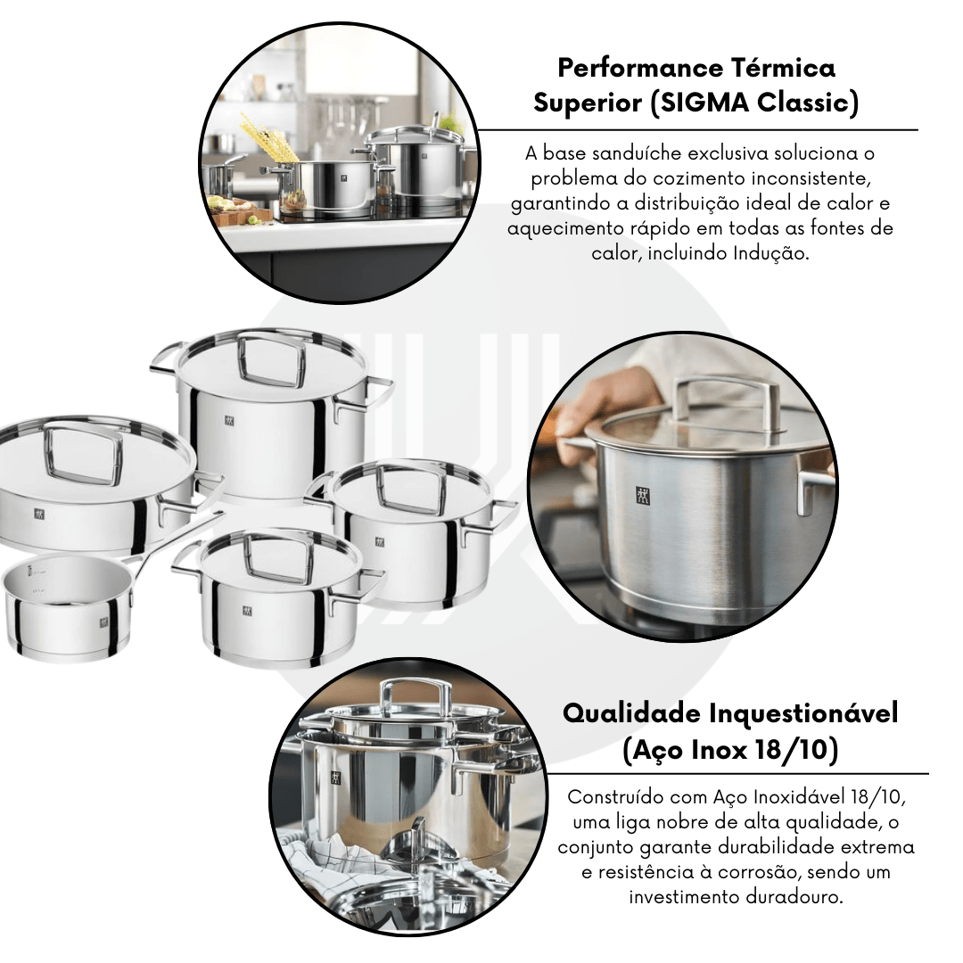 O conjunto é construído em Aço Inoxidável 18/10 de alta qualidade, uma liga nobre que garante durabilidade e higiene superior. O diferencial de performance inigualável está na Base Sanduíche SIGMA Classic (Aço Inox + Alumínio + Aço Inox), que soluciona o problema da distribuição desigual de calor. Esta tecnologia garante o aquecimento rápido e a retenção ideal de temperatura.