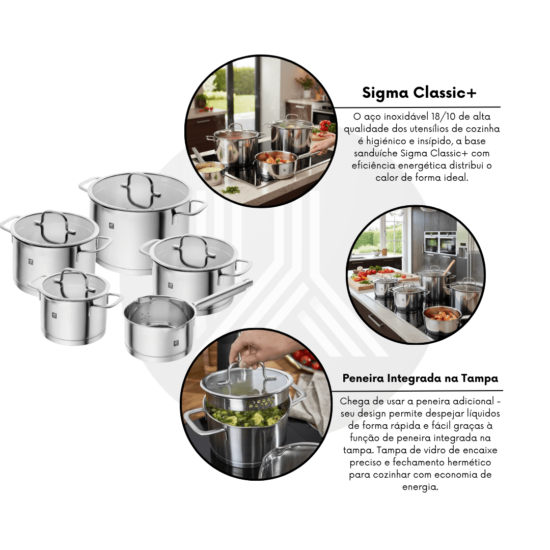 A performance é garantida pela base sanduíche Sigma Classic+, com eficiência energética premium. Esta base distribui o calor de forma rápida e perfeitamente uniforme, ajudando a cozinhar com economia de energia. As panelas são compatíveis com todas as fontes de calor, incluindo fogões de indução, e podem ser lavadas na máquina de lavar louça.