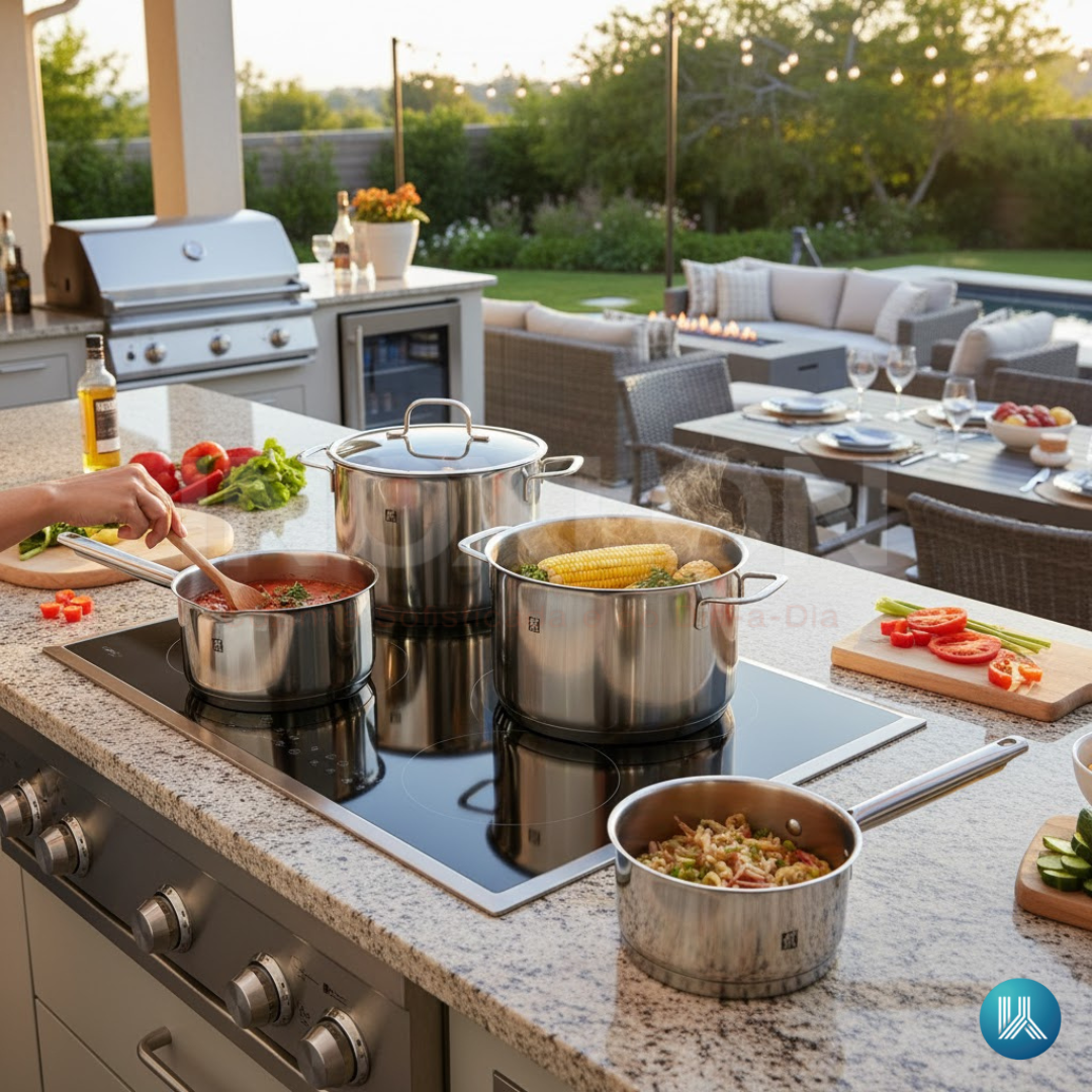 Material de Luxo (Aço Inox 18/10): Um material premium, higiênico e que não altera o sabor dos alimentos. É robusto, resistente a arranhões e resolve o problema de panelas que se desgastam rapidamente com o uso intenso.