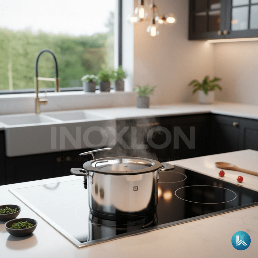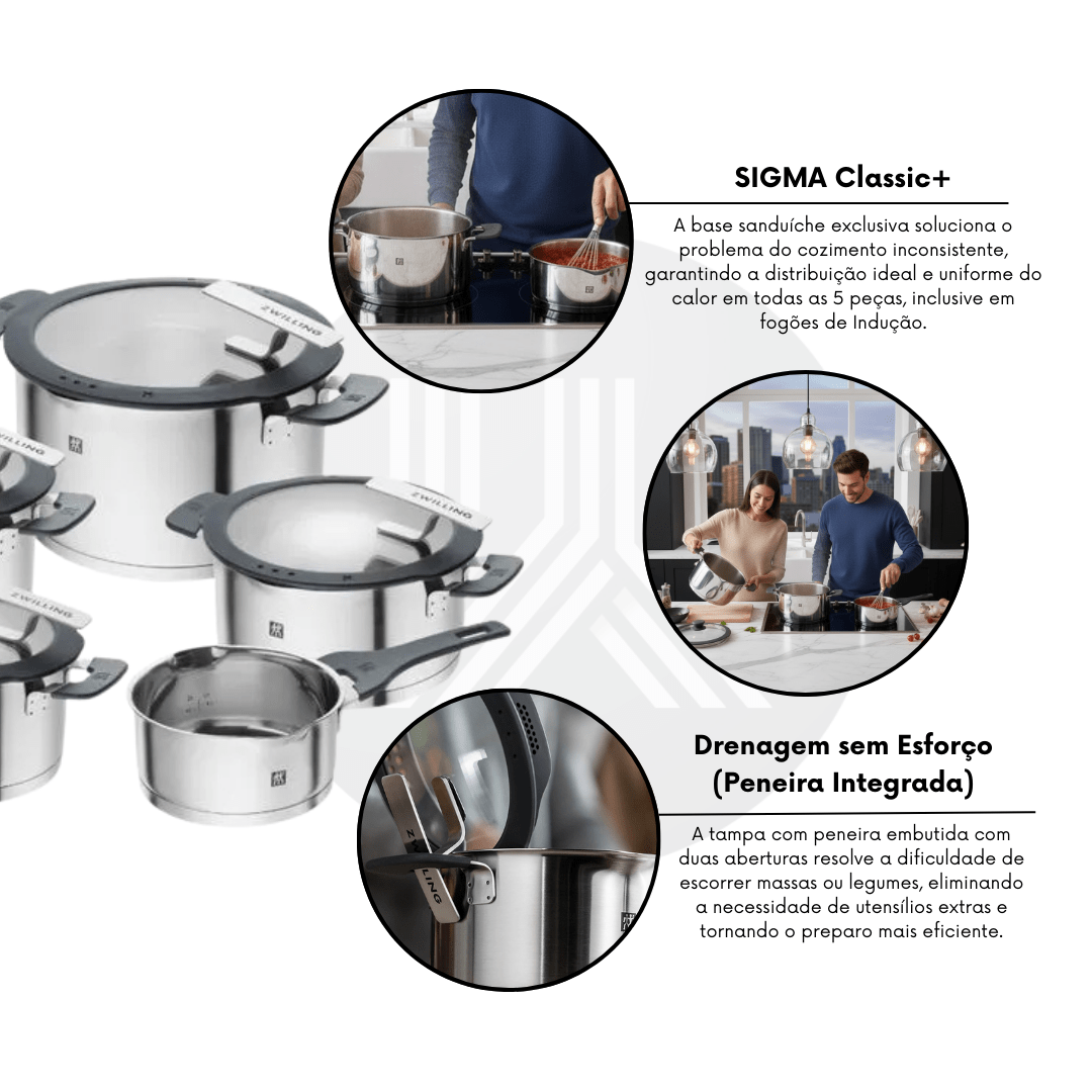 Performance Térmica Perfeita (SIGMA Classic+): A base sanduíche exclusiva soluciona o problema do cozimento inconsistente, garantindo a distribuição ideal e uniforme do calor em todas as 5 peças, inclusive em fogões de Indução.