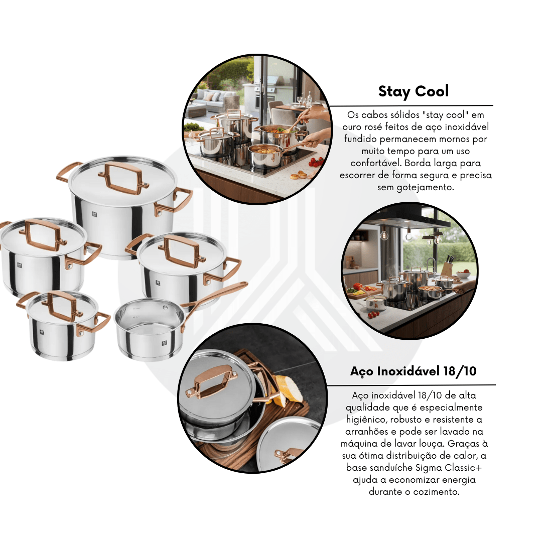 Fabricadas em Aço Inoxidável 18/10 de alta qualidade, as panelas são higiênicas, robustas e resistentes a arranhões. A performance é garantida pela base sanduíche Sigma Classic+, com eficiência energética premium, que distribui o calor de forma rápida e perfeitamente uniforme. As alças "stay cool" em aço inoxidável fundido (no tom Ouro Rosé) permanecem frias por mais tempo, garantindo um uso confortável.