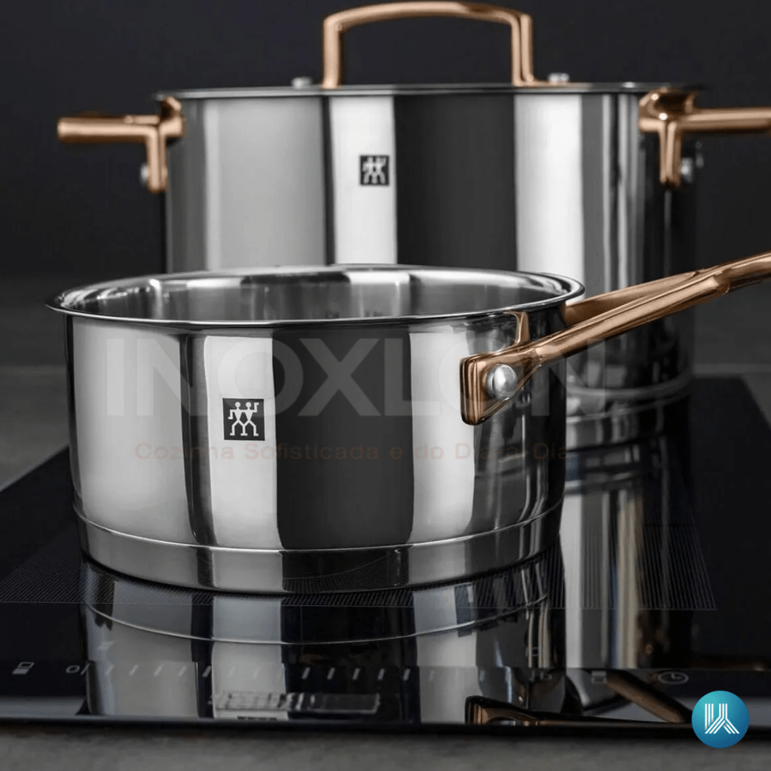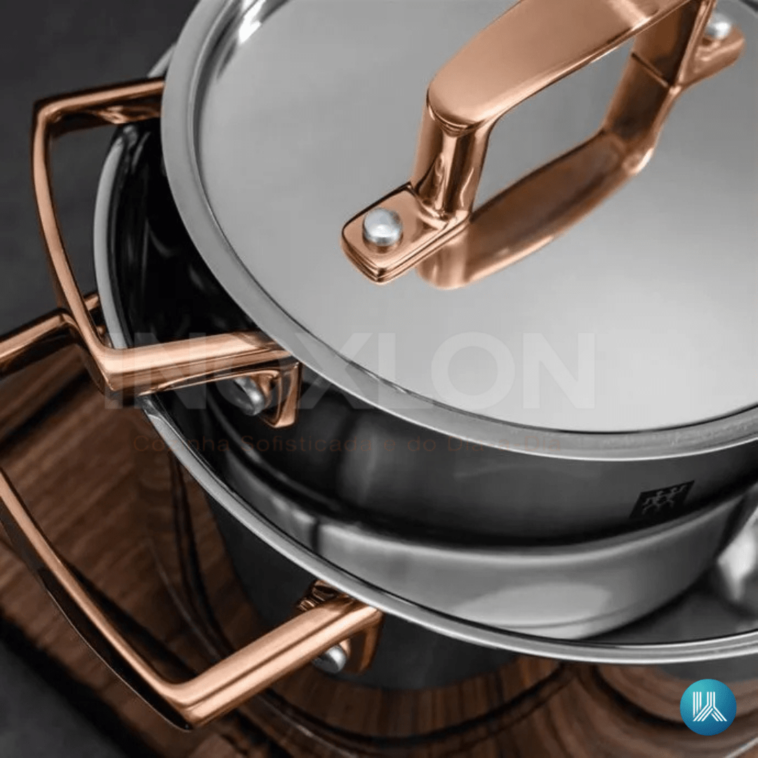 O conjunto de panelas de 5 peças ZWILLING Bellasera é a definição de luxo e design para a cozinha premium. Pensado para quem ama cozinhar com segurança, mas exige um visual extravagante, este conjunto é a escolha certa. O destaque absoluto são os puxadores e alças em Ouro Rosé (Rose Gold) brilhante, um toque de sofisticação que eleva o nível de qualquer cozinha e garante "curtidas" dos seus seguidores.