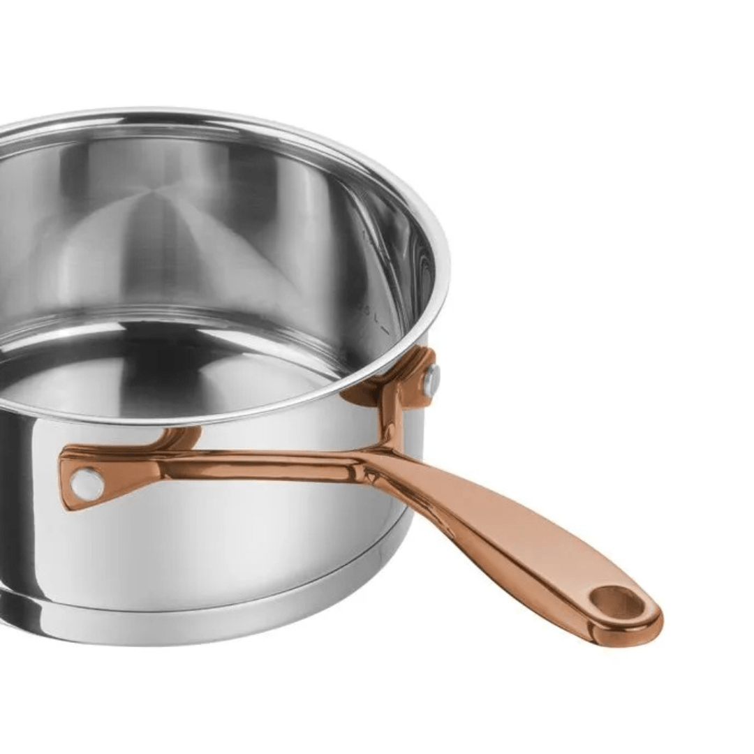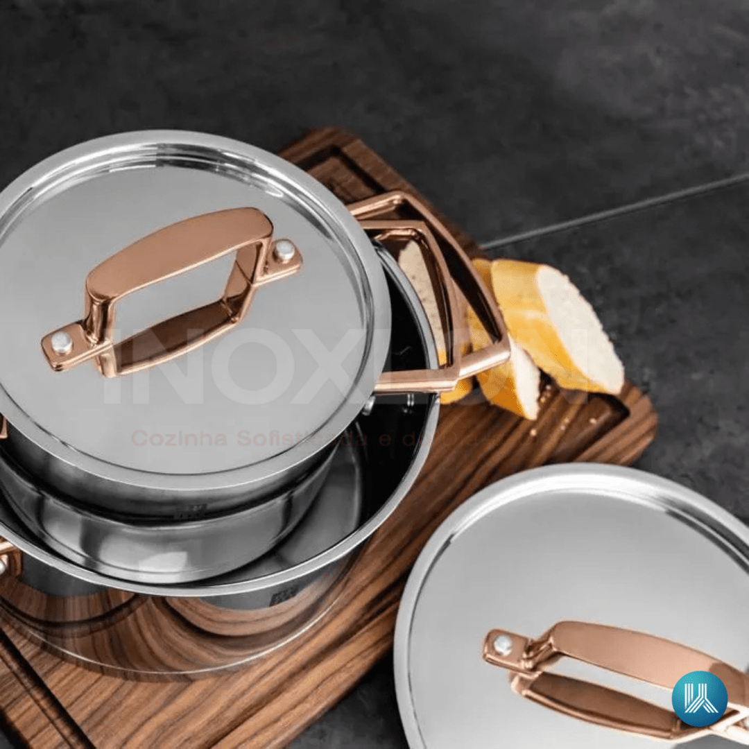 Design de Luxo (Ouro Rosé): O diferencial único deste conjunto. As alças e puxadores em Ouro Rosé brilhante resolvem o problema de panelas com design comum, transformando o conjunto em uma peça de decoração premium que pode ir do fogão direto para a mesa.