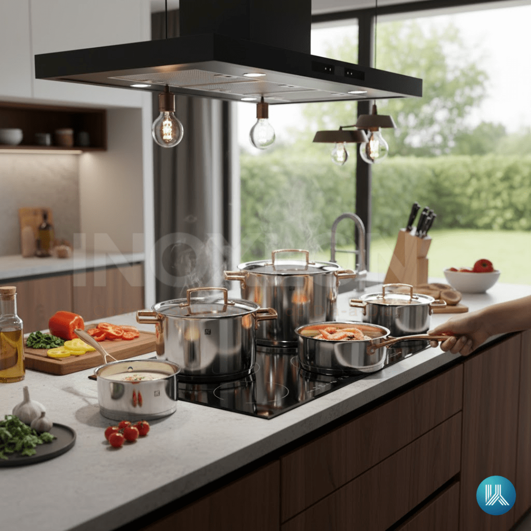 Material de Luxo (Aço Inox 18/10): Um material premium, higiênico e que não altera o sabor dos alimentos. É robusto, resistente a arranhões e seguro para ir à máquina de lavar louça, resolvendo o problema da limpeza difícil.