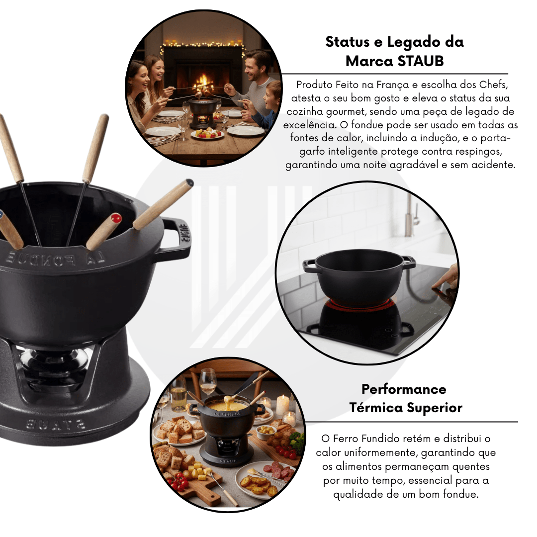 Performance Térmica Superior: O Ferro Fundido retém e distribui o calor uniformemente, garantindo que os alimentos permaneçam quentes por muito tempo, essencial para a qualidade de um bom fondue.