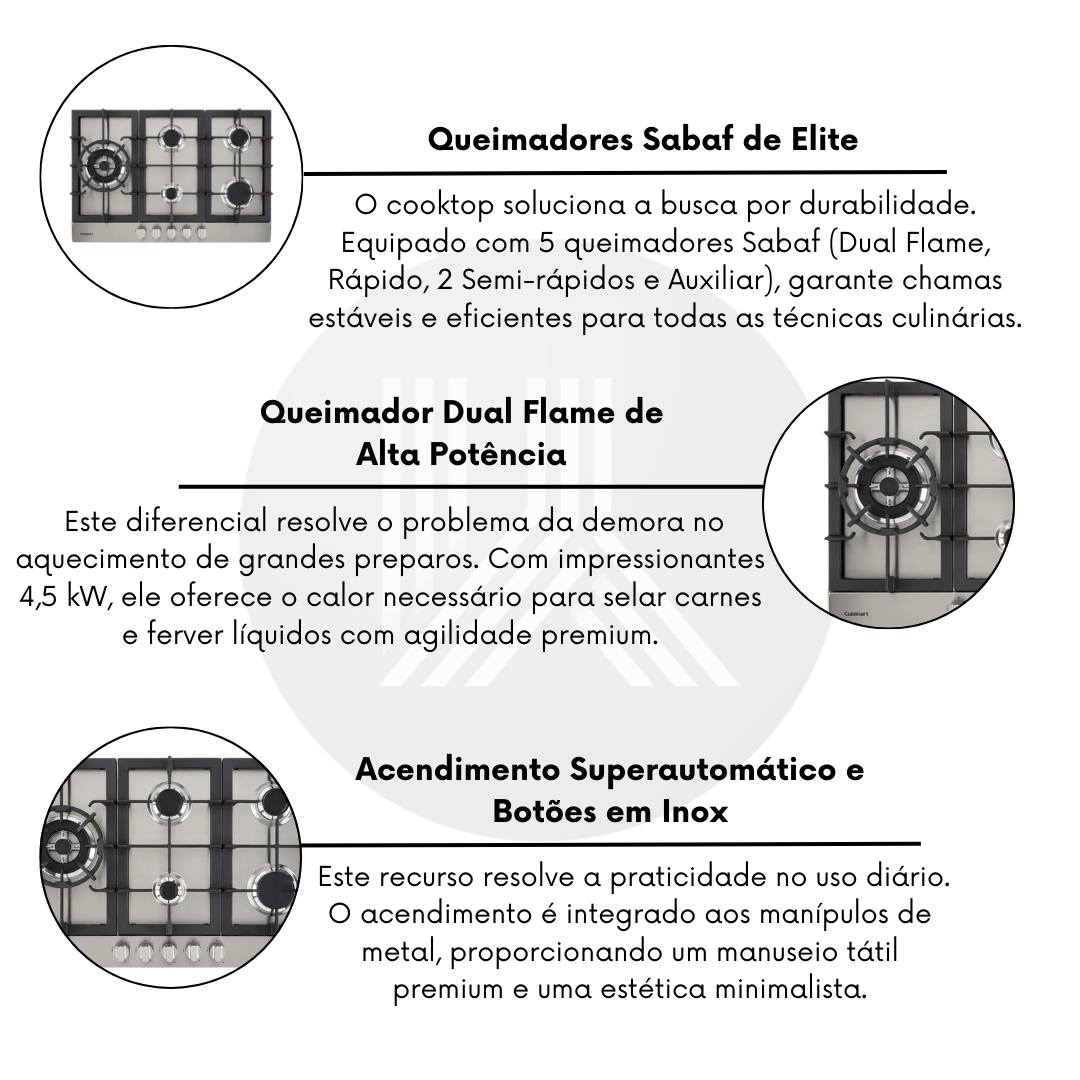 O Cooktop a Gás Cuisinart Prime Cooking é o sinônimo de elegância e bom gosto para cozinhas de alto padrão. Construído em Aço Inox 304 de alta resistência, este modelo soluciona a necessidade de uma cocção veloz e precisa através dos renomados queimadores italianos Sabaf, que entregam uma potência total de 11,5 kW. Com um layout exclusivo que traduz a sintonia entre design e performance premium, ele oferece a robustez de uma linha semi-profissional em um formato perfeitamente integrado à marcenaria. É um investimento de luxo para quem não abre mão da segurança, contando com sistemas avançados que garantem tranquilidade total durante o preparo de suas melhores experiências gastronômicas.