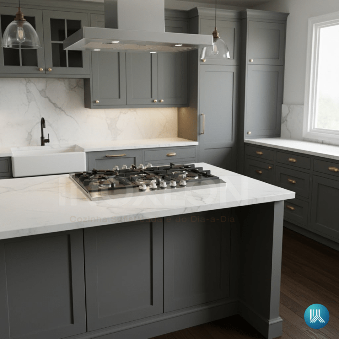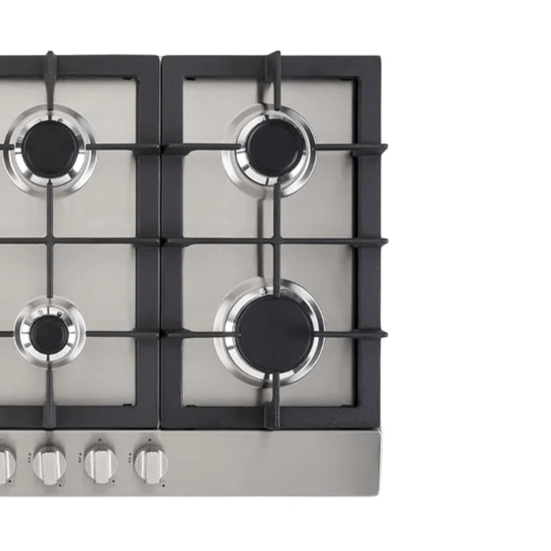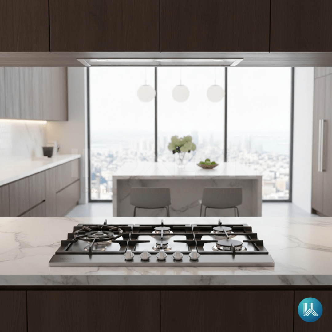 Trempes em Ferro Fundido: As grades robustas resolvem a estabilidade das panelas. Além de conferirem um visual de alto padrão, oferecem resistência térmica superior e facilitam o deslizamento entre os queimadores.