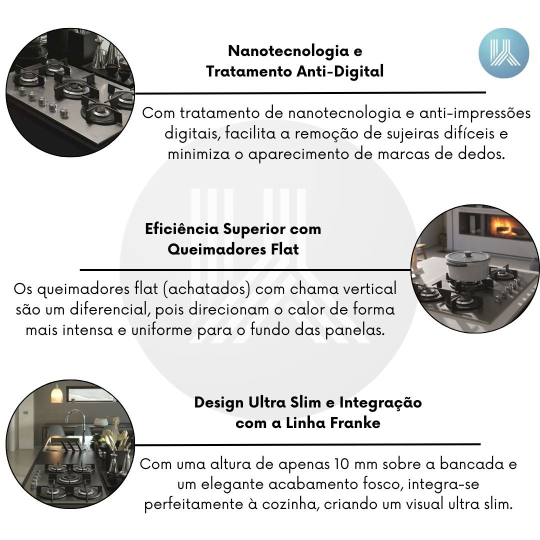 - Diferencial: Nanotecnologia aplicada a superfície da mesa, facilitando limpeza contra marcas de impressões digitais. Queimadores flat com chamas no formato vertical que aumentam a eficiência do produto
