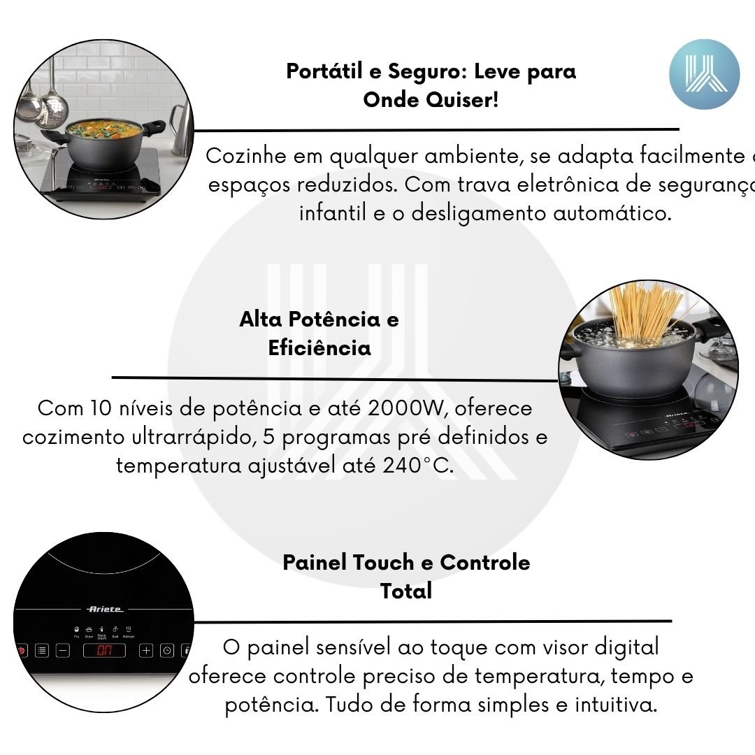 Cozinhar com agilidade, segurança e estilo nunca foi tão simples. O Cooktop de Indução Portátil Ariete 1997 combina tecnologia moderna e design compacto para proporcionar uma experiência prática e funcional. Ideal para cozinhas pequenas, viagens, acampamentos ou até mesmo em uso no escritório, ele entrega potência de até 2000W e total controle de temperatura com apenas um toque. Compacto, eficiente e fácil de limpar, é o aliado perfeito para quem busca liberdade e performance na hora de cozinhar.