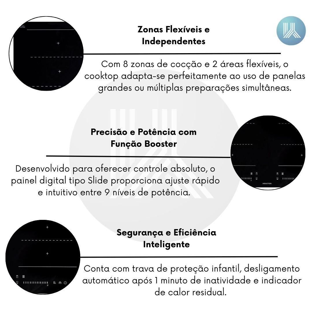 Com 8 zonas de cocção e 2 áreas flexíveis, o cooktop adapta-se perfeitamente ao uso de panelas grandes ou múltiplas preparações simultâneas. A função de zona flexível permite unir duas zonas em uma única superfície de aquecimento contínuo, garantindo versatilidade e praticidade em qualquer receita. Ideal para quem busca liberdade total no preparo de pratos elaborados.