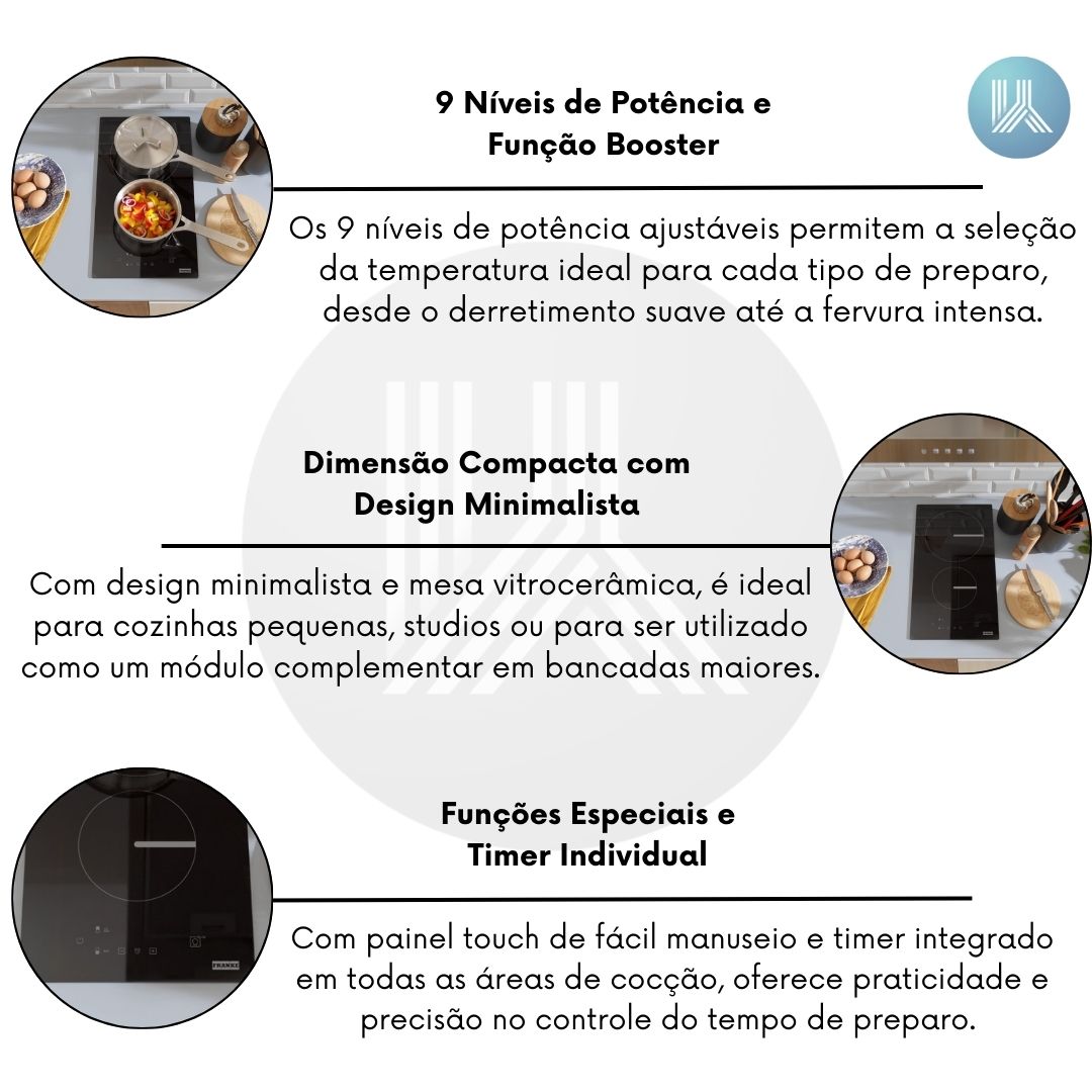 Com seu tamanho reduzido de 28 cm, o Cooktop FSM 302 é ideal para cozinhas pequenas, studios ou para ser utilizado como um módulo complementar em bancadas maiores. Seu design minimalista e a mesa em vitrocerâmico preto garantem um visual clean e moderno, otimizando o espaço sem sacrificar a funcionalidade e a elegância.