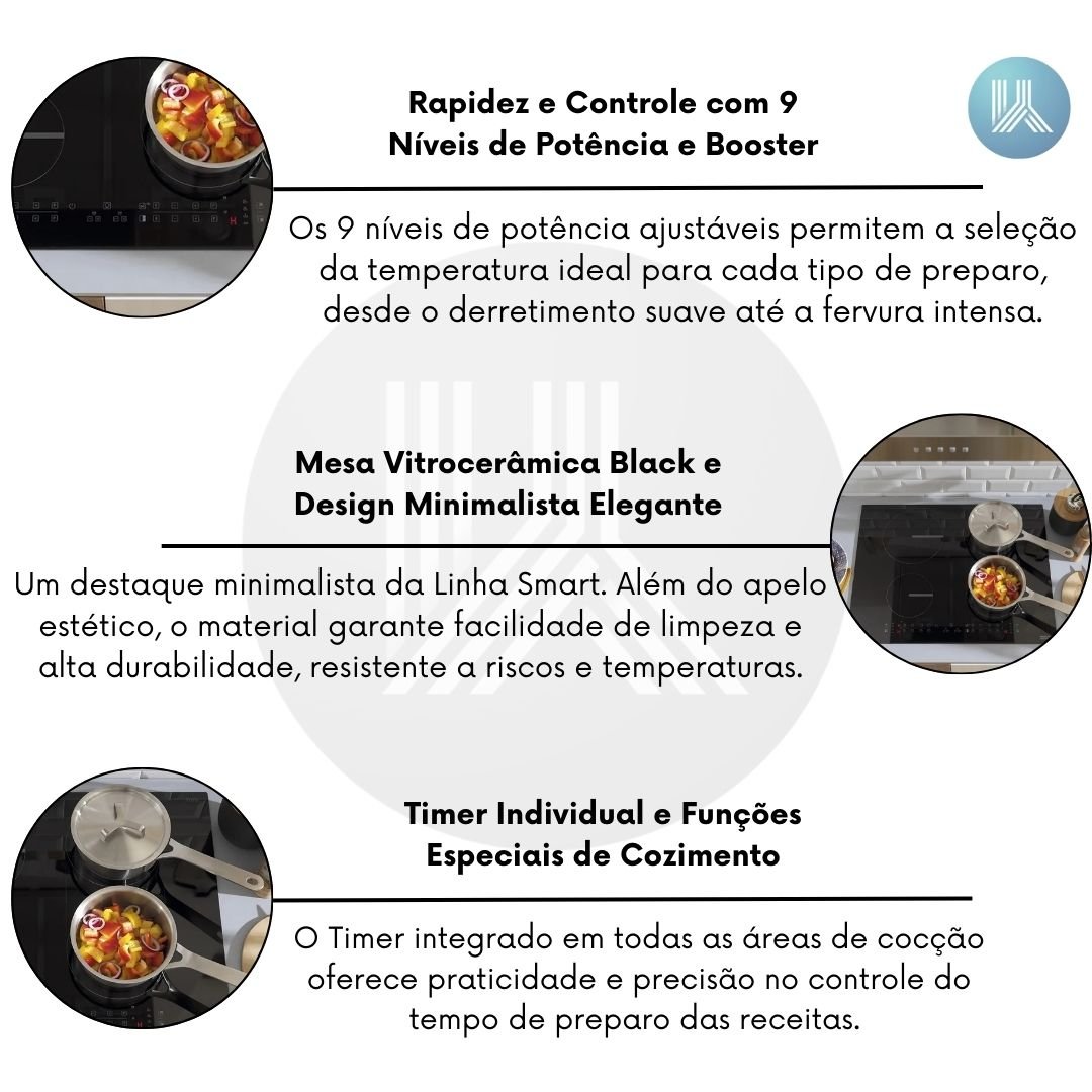 Este cooktop de indução de 4 zonas garante rapidez e controle incomparáveis no aquecimento. Os 9 níveis de potência ajustáveis permitem a seleção da temperatura ideal para cada tipo de preparo, desde o derretimento suave até a fervura intensa. A função booster aumenta a potência momentaneamente, sendo perfeita para acelerar o cozimento inicial de líquidos.