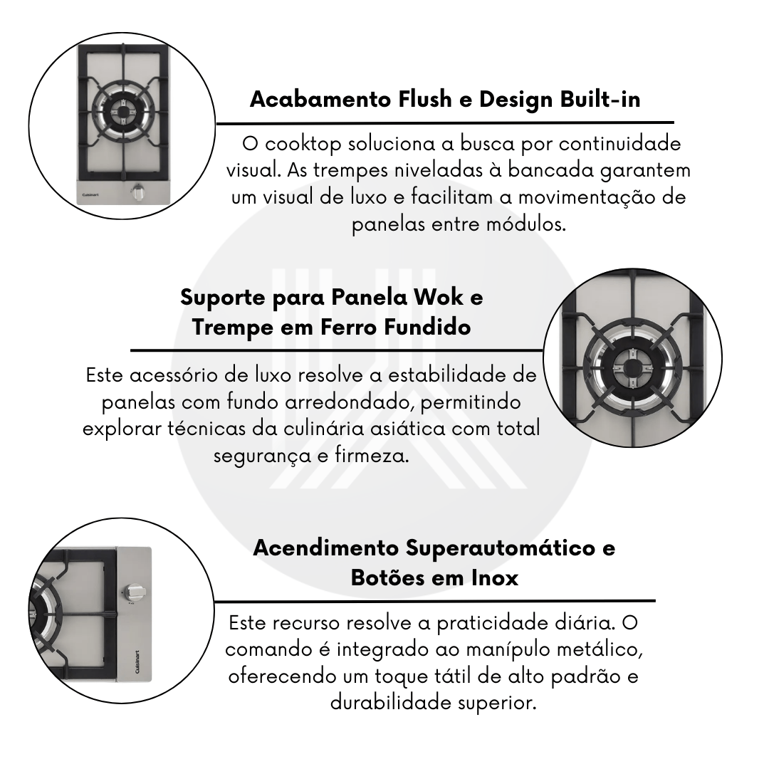 O Dominó a Gás Cuisinart Prime Cooking é o sinônimo de elegância e bom gosto para cozinhas de alto padrão que prezam pela modularidade. Fabricado em Aço Inox 304, este modelo soluciona a necessidade de uma cocção potente em espaços reduzidos através do seu queimador Dual Flame de 4,3 kW, capaz de entregar resultados de nível semi-profissional. Com o exclusivo acabamento flush, onde as trempes ficam ao nível da bancada, ele proporciona um encaixe estético perfeito na pedra, traduzindo a sintonia ideal entre design e performance premium. É um investimento de luxo indispensável para quem deseja compor uma bancada personalizada com flexibilidade, segurança avançada e sofisticação técnica.